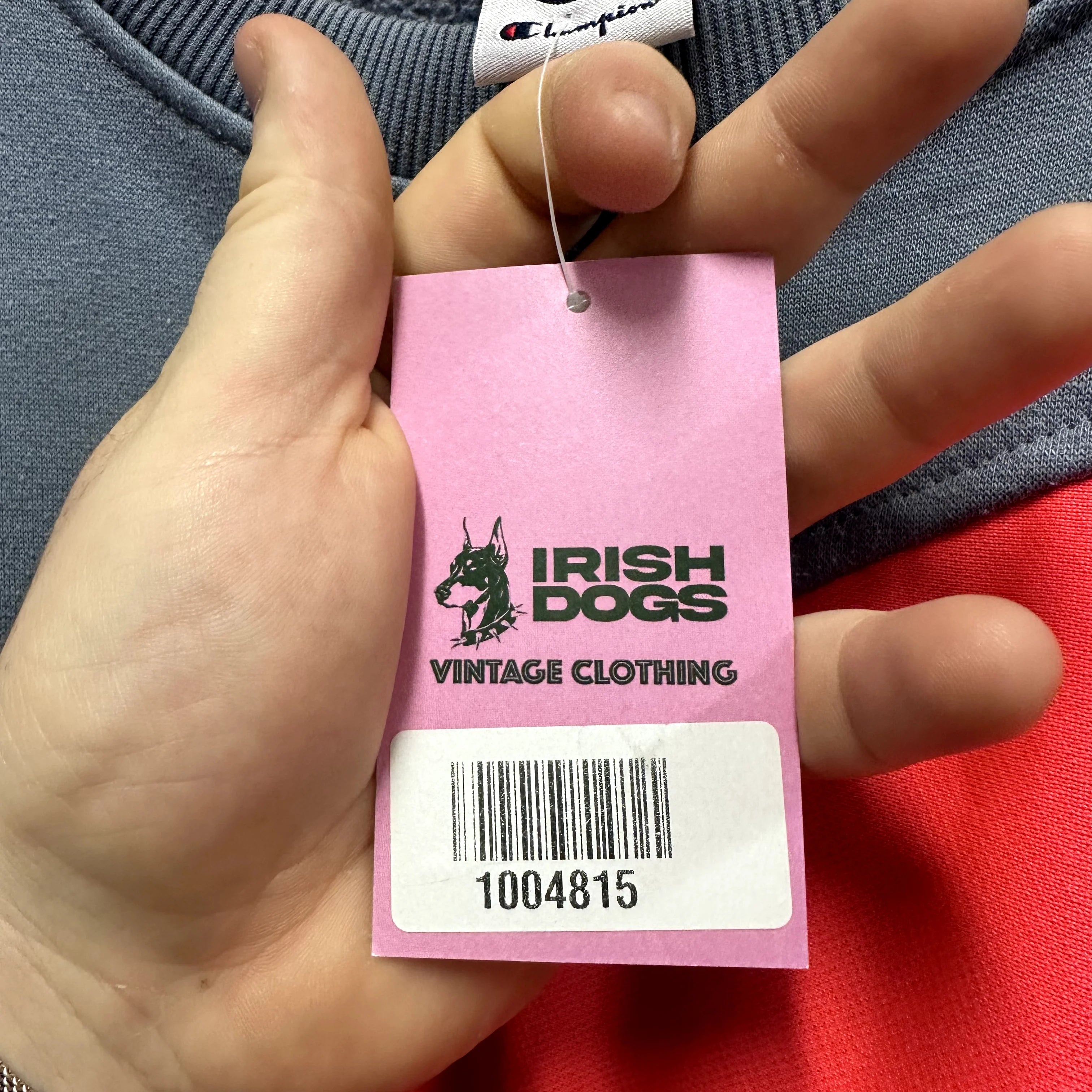 Product details: Gray crewneck sweatshirt with red geometric panel inserts, small Champion logo embroidery on chest, ribbed trim, tag size XL, distinctive colorblock styling. Brand: Champion.| Label Size | |