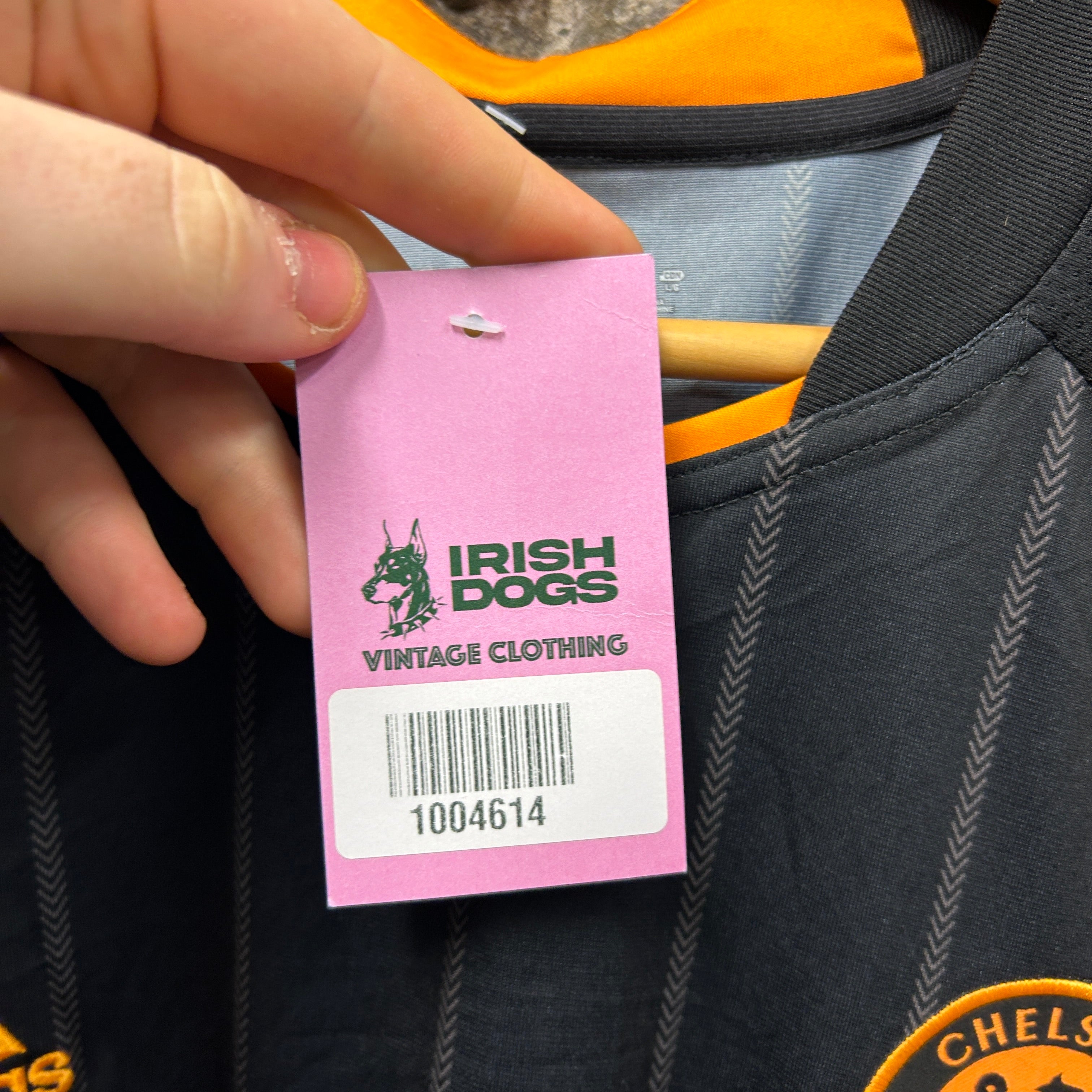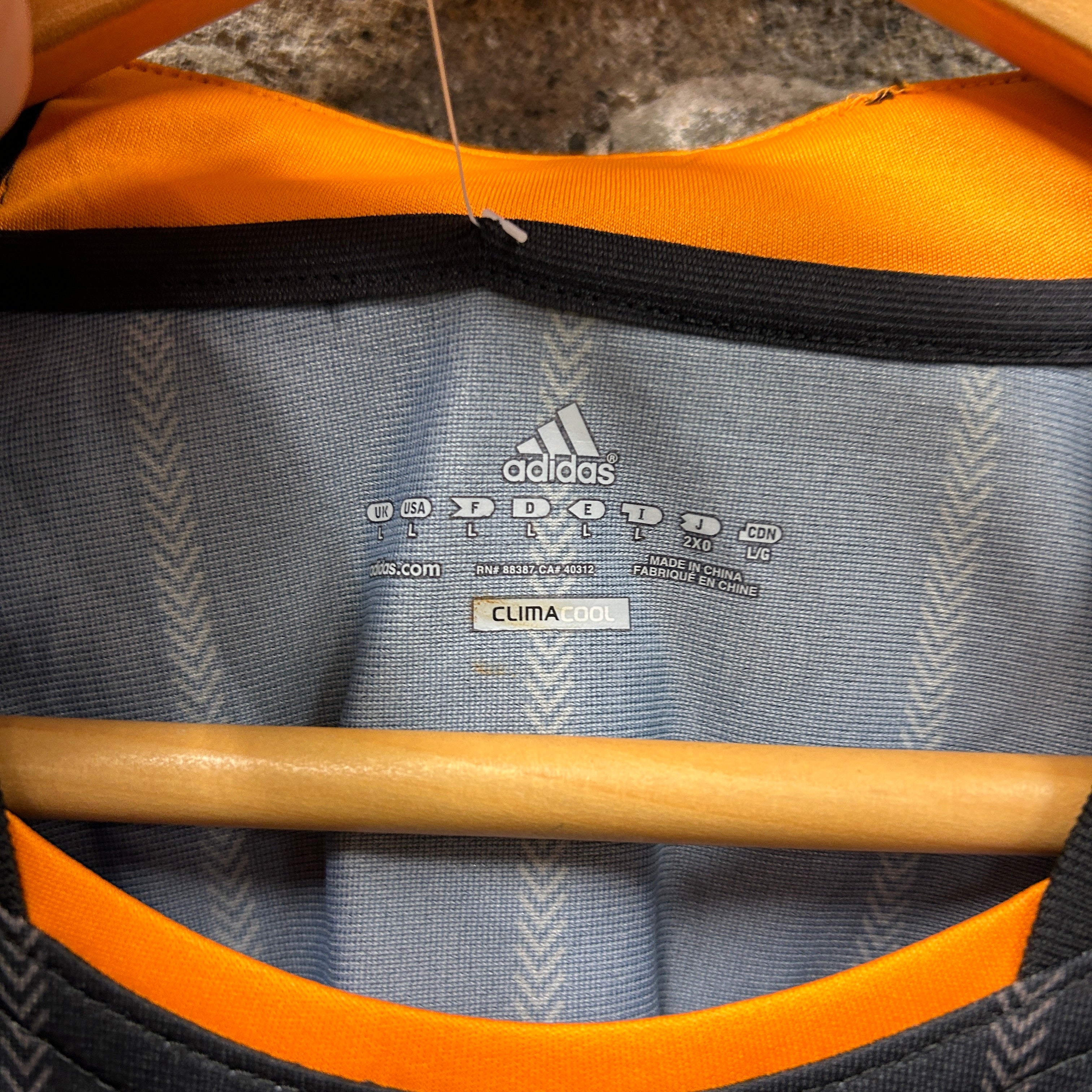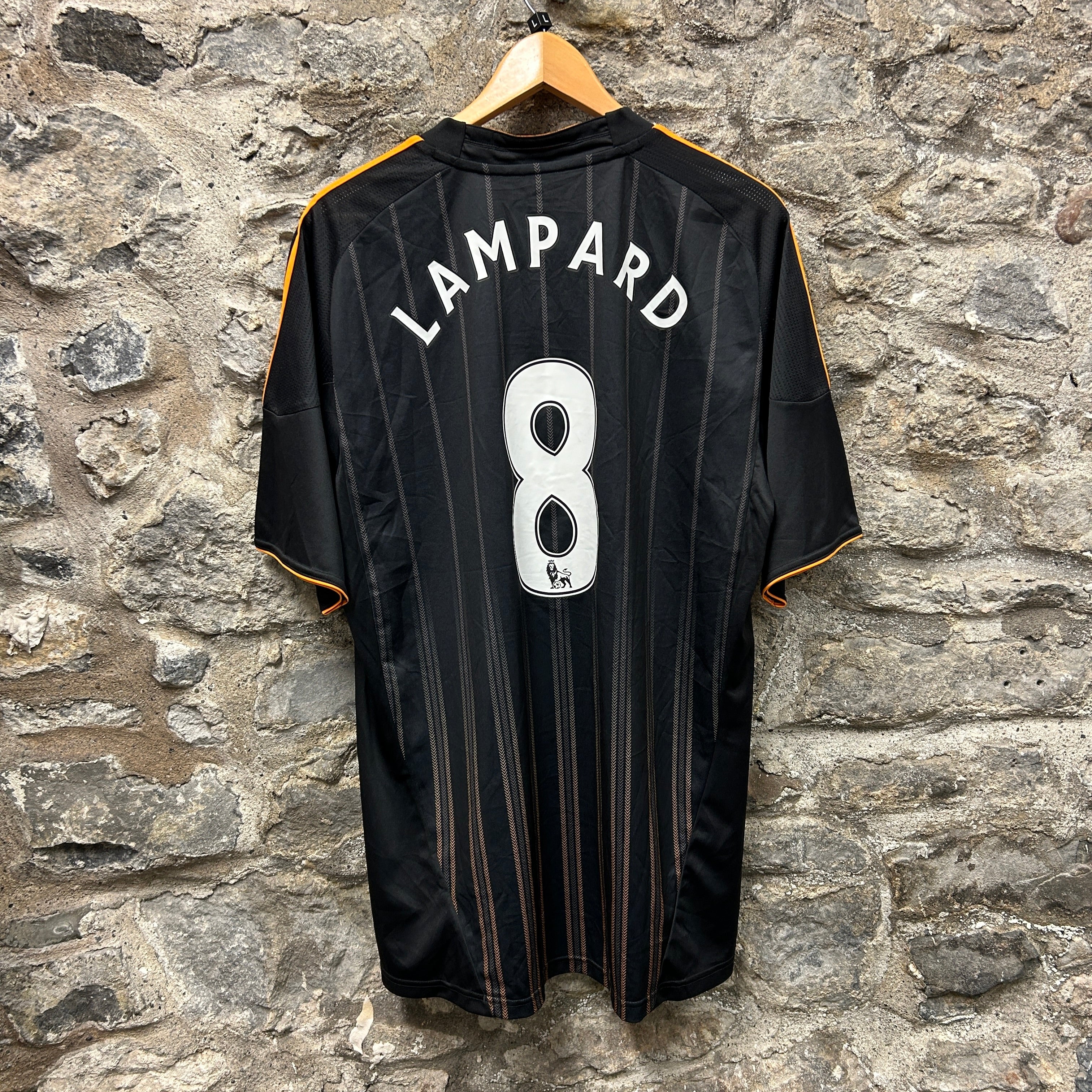 Product details: Adidas Chelsea FC football shirt in black with tonal grey herringbone/pinstripe vertical pattern. Bright orange accents with triple-stripe shoulder taping and orange collar lining/piping. Front features embroidered adidas logo, Chelsea crest patch, and large SAMSUNG sponsor print. Back has official-style name/number set: LAMPARD and number 8 with small Premier League lion detail at the base. Climacool performance fabric with Climacool logo at hem and small adidas badge near lower side; tag shows 05/10 (likely 2010-era production). Brand: Adidas.| Label Size | |