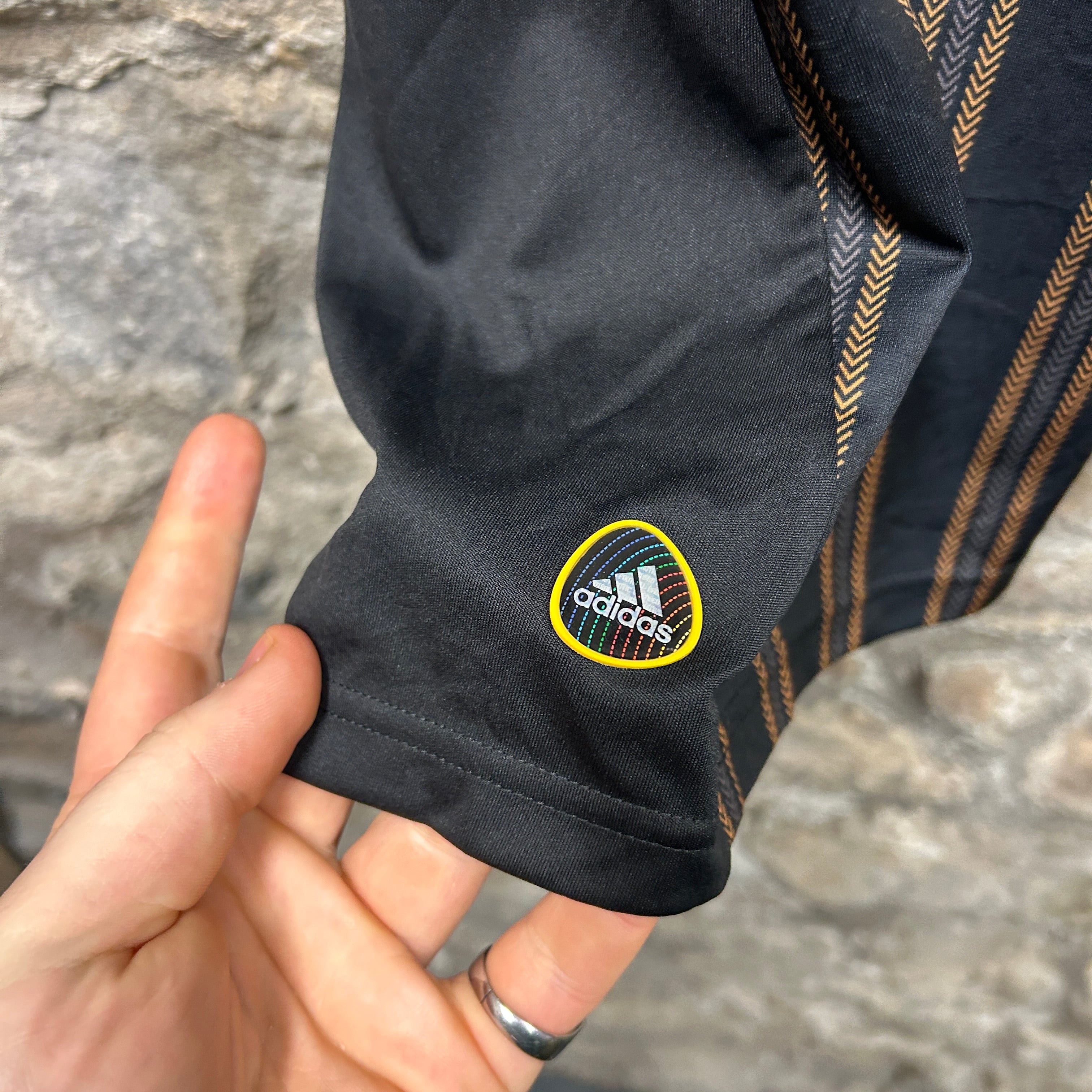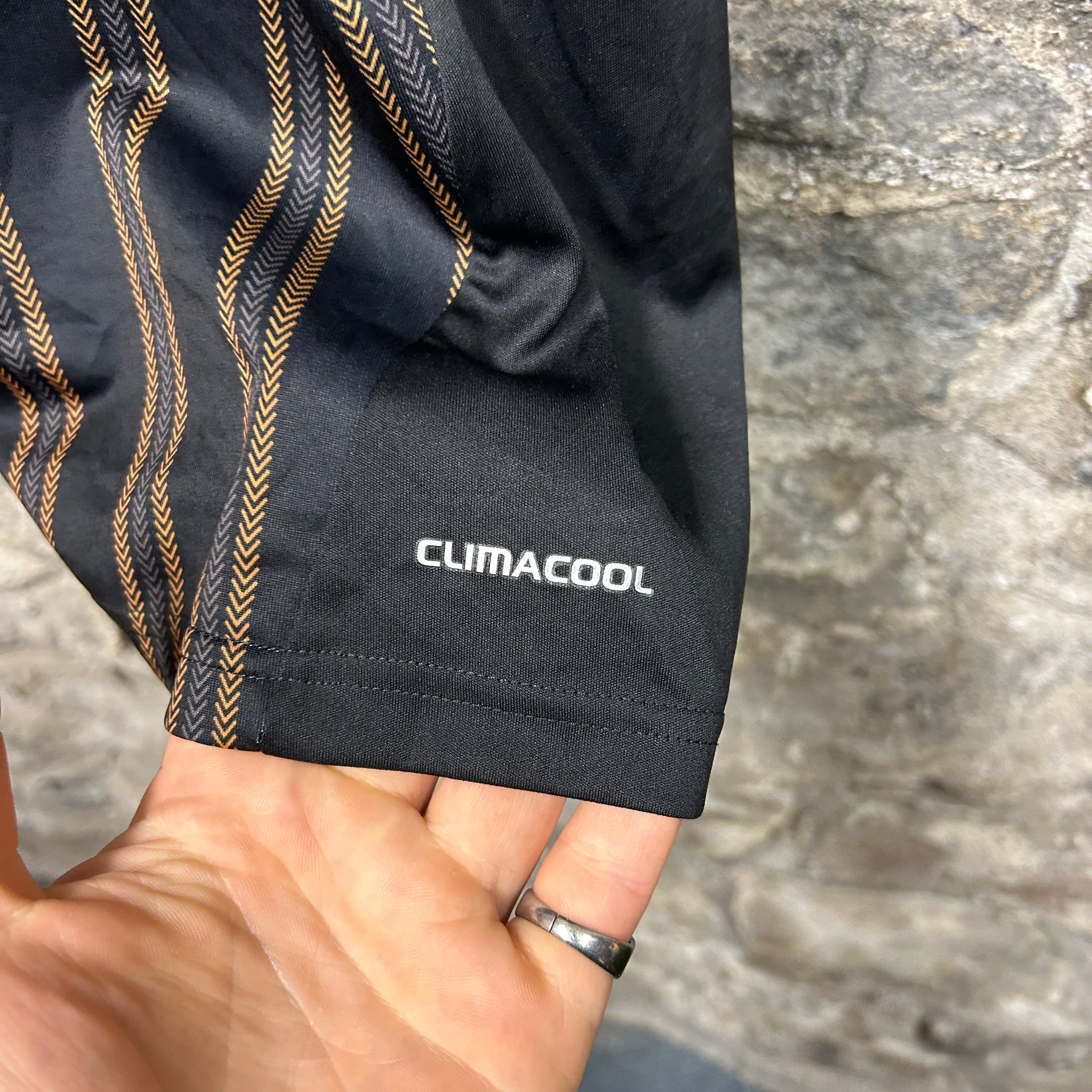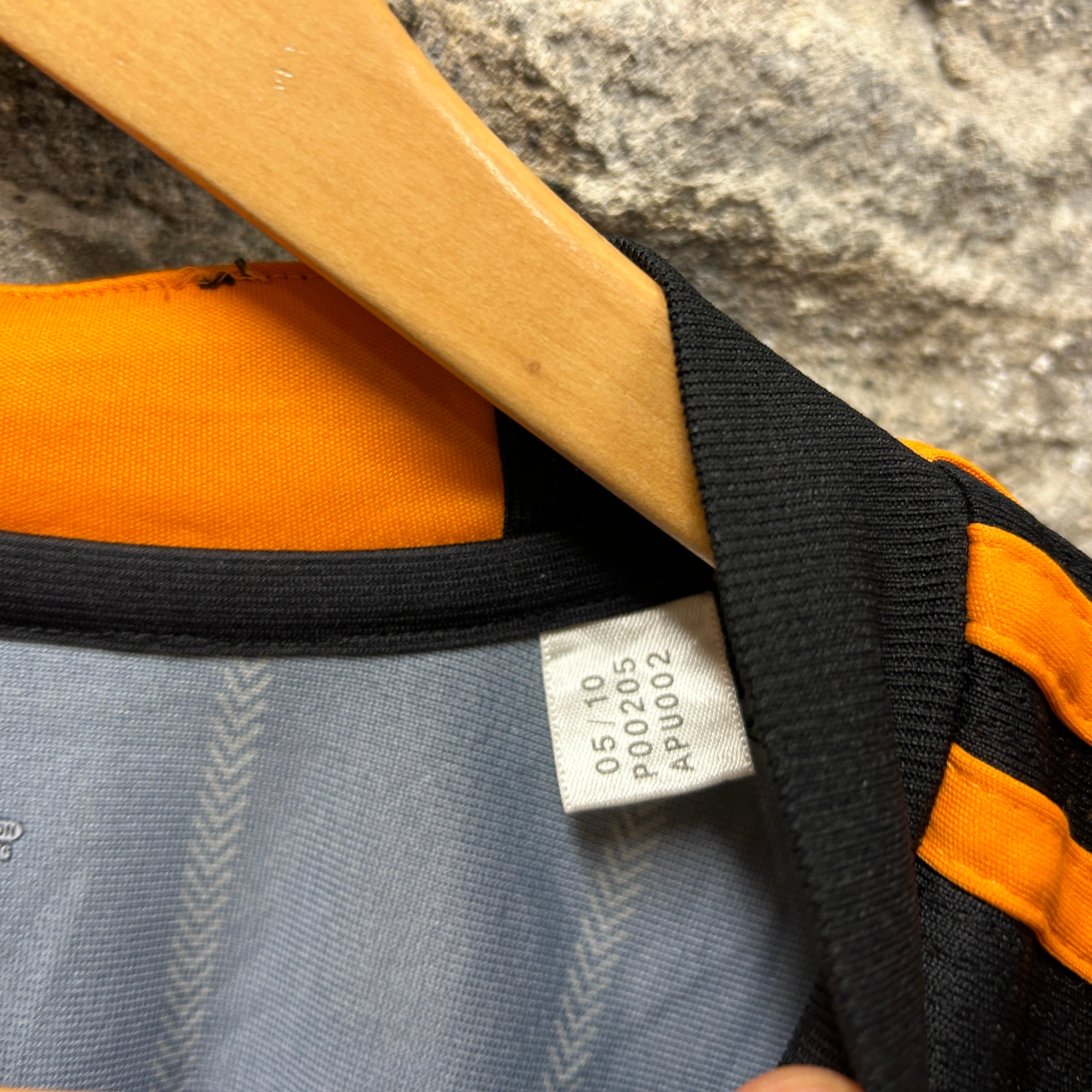 Product details: Adidas Chelsea FC football shirt in black with tonal grey herringbone/pinstripe vertical pattern. Bright orange accents with triple-stripe shoulder taping and orange collar lining/piping. Front features embroidered adidas logo, Chelsea crest patch, and large SAMSUNG sponsor print. Back has official-style name/number set: LAMPARD and number 8 with small Premier League lion detail at the base. Climacool performance fabric with Climacool logo at hem and small adidas badge near lower side; tag shows 05/10 (likely 2010-era production). Brand: Adidas.| Label Size | |