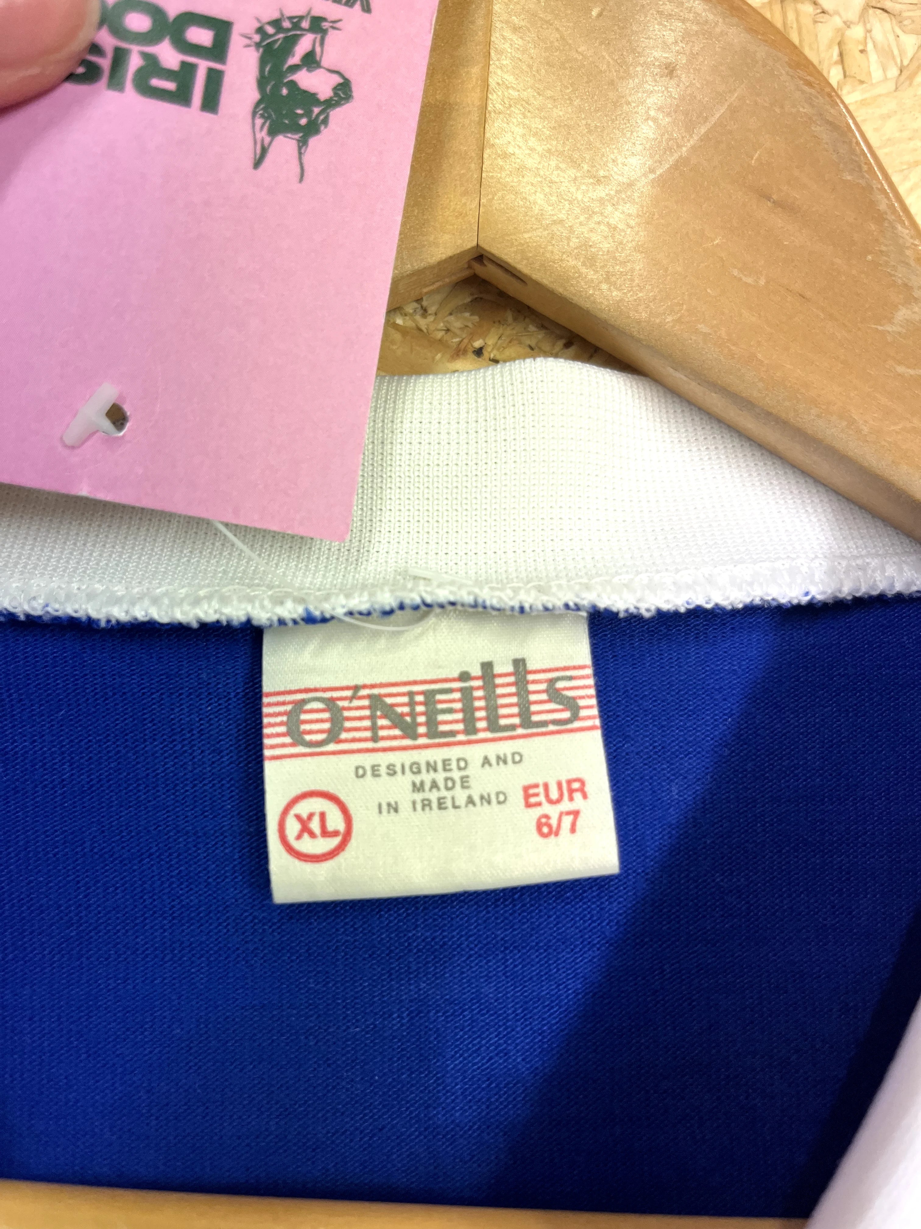 Product details: Blue and white color block, yellow accents, Laois crest, Meadow Meats sponsor, O'Neills branding, fold-over collar, 1999 issue. Brand: O'neills.| Label Size | |