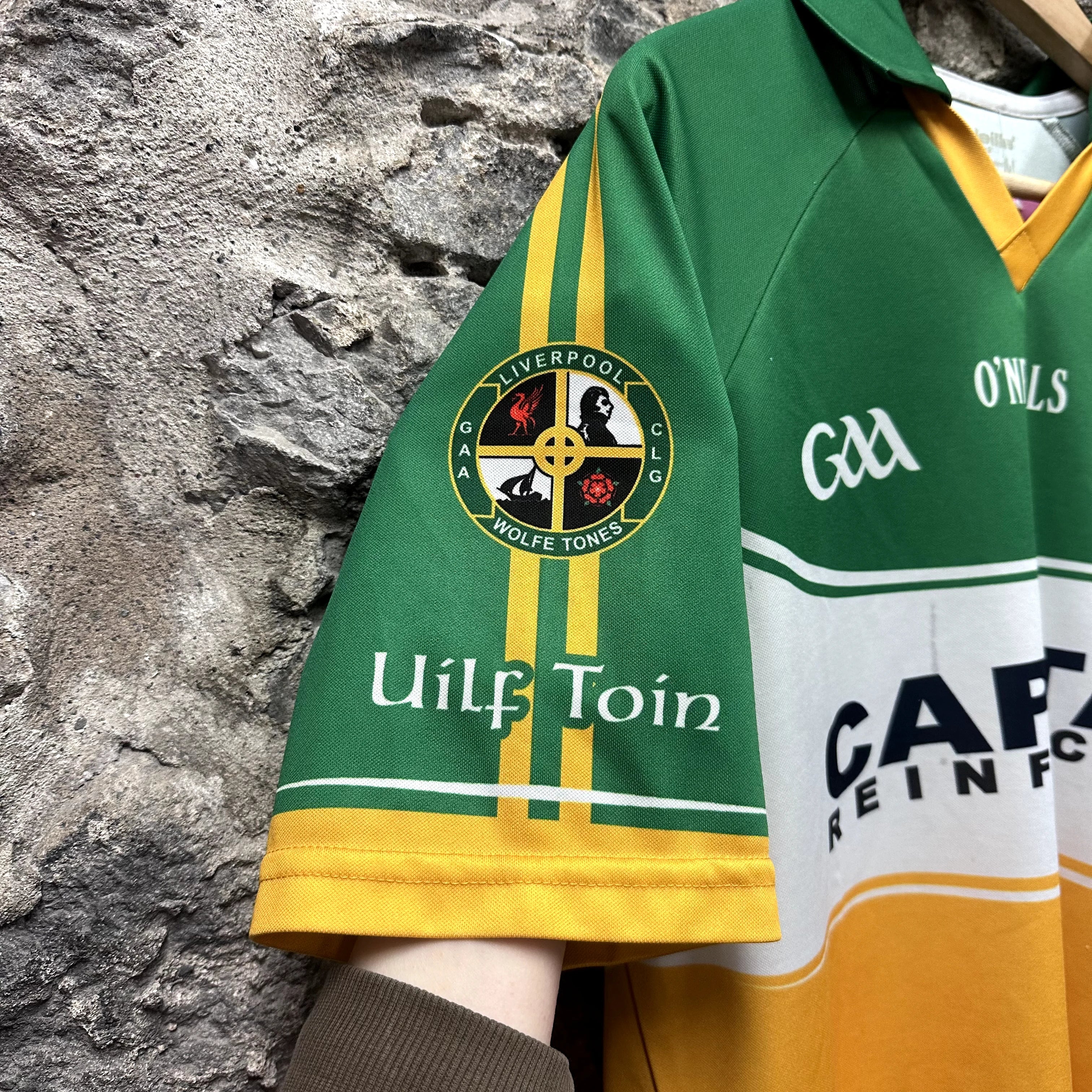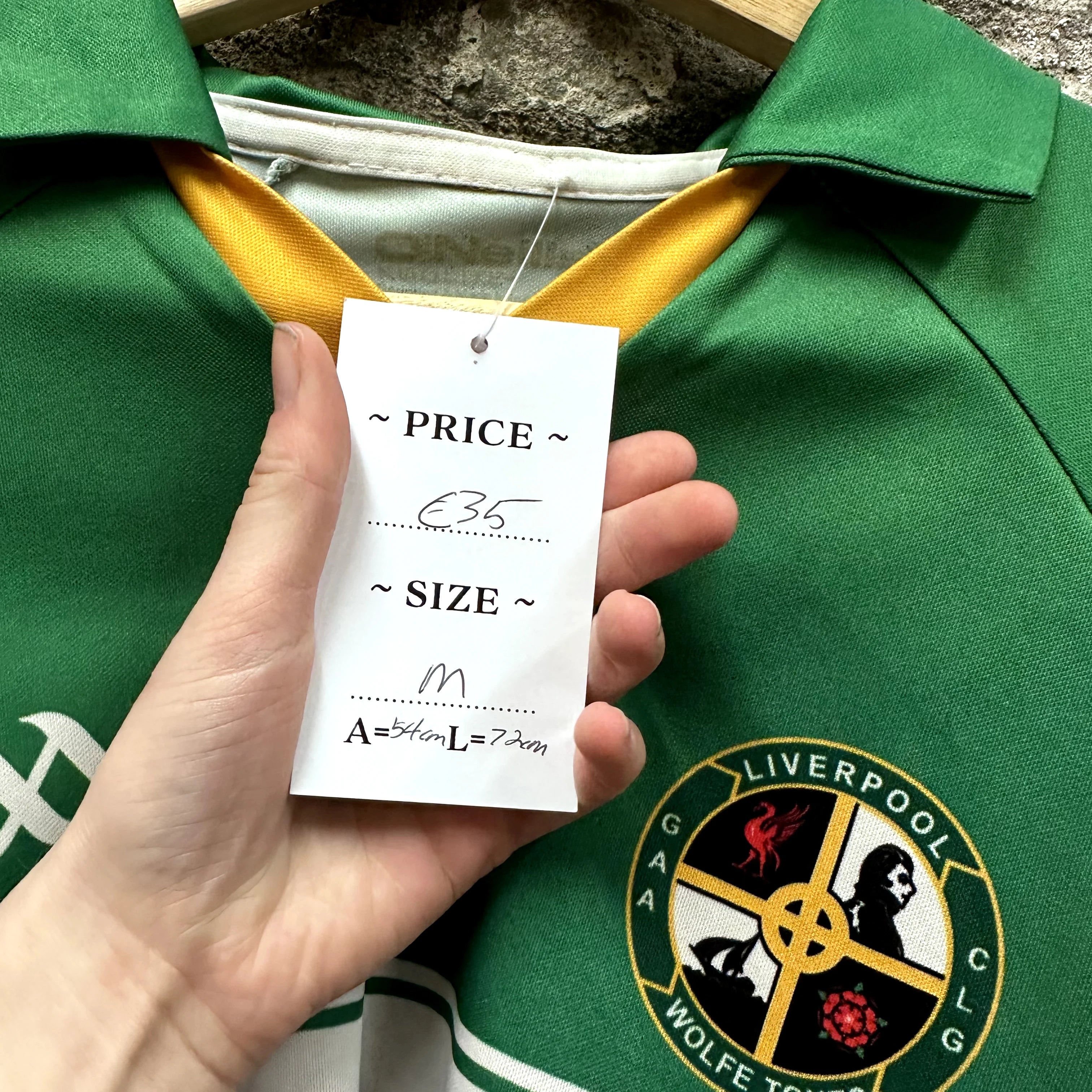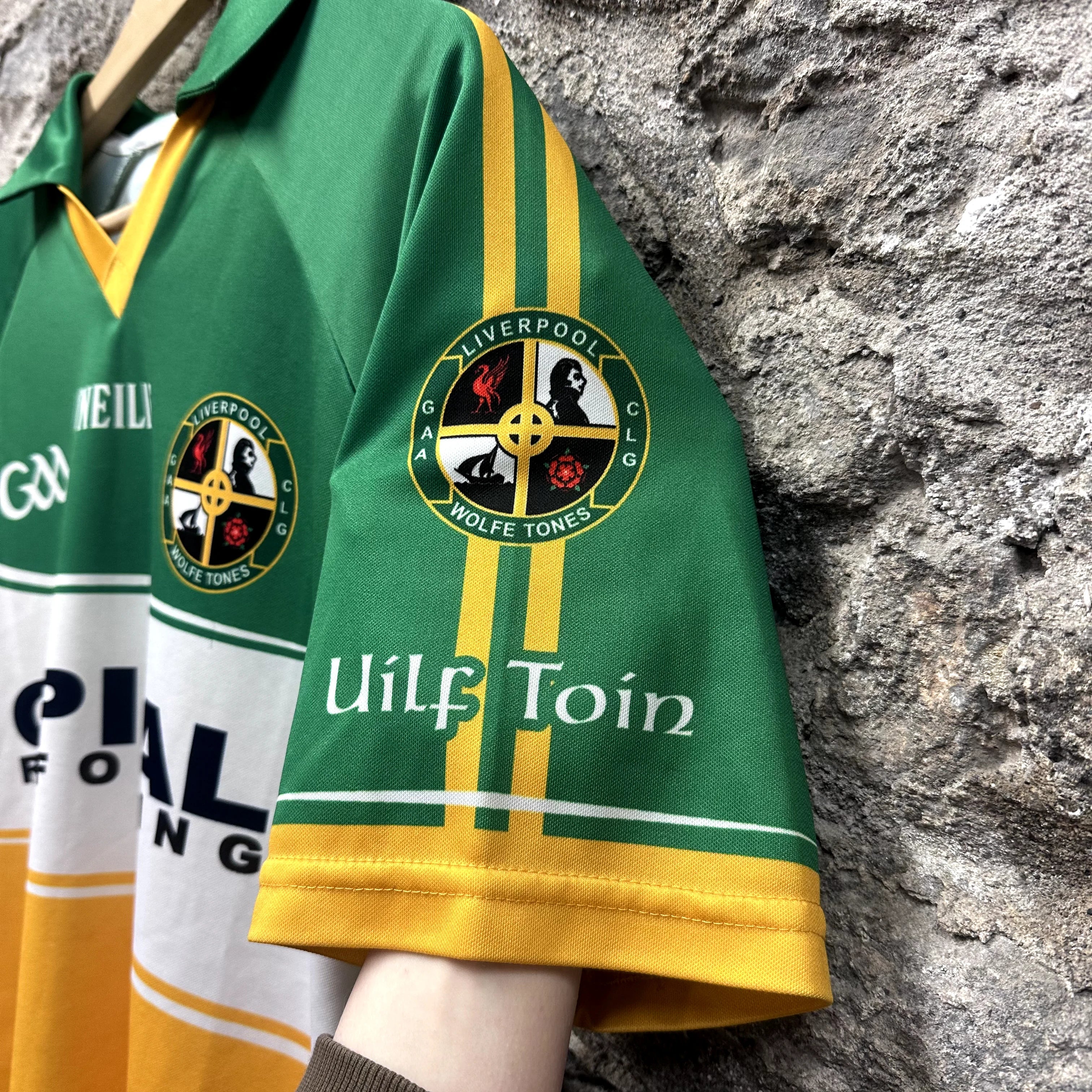 Product details: Green, white, and gold color block GAA jersey with Liverpool Wolfe Tones crest, sponsor and GAA branding, raglan sleeves, Irish language embellishments, and classic O'Neills collar; KOOLITE fabric. Brand: O'neills.| Label Size | |