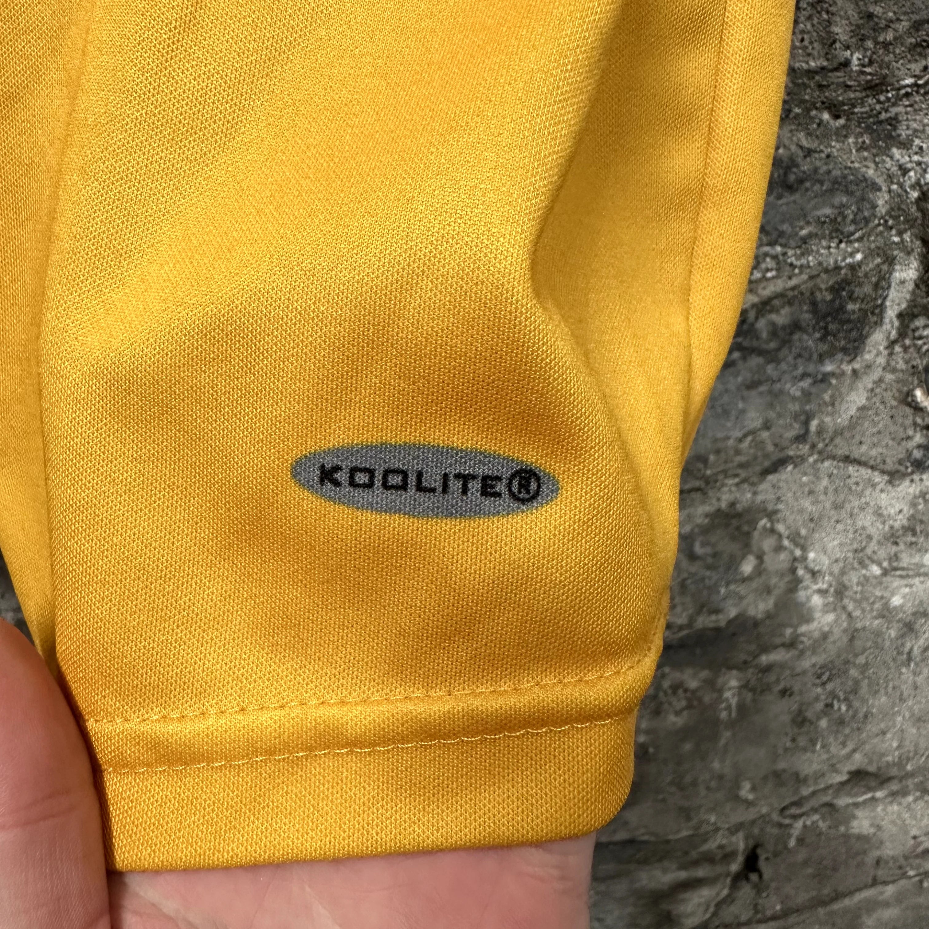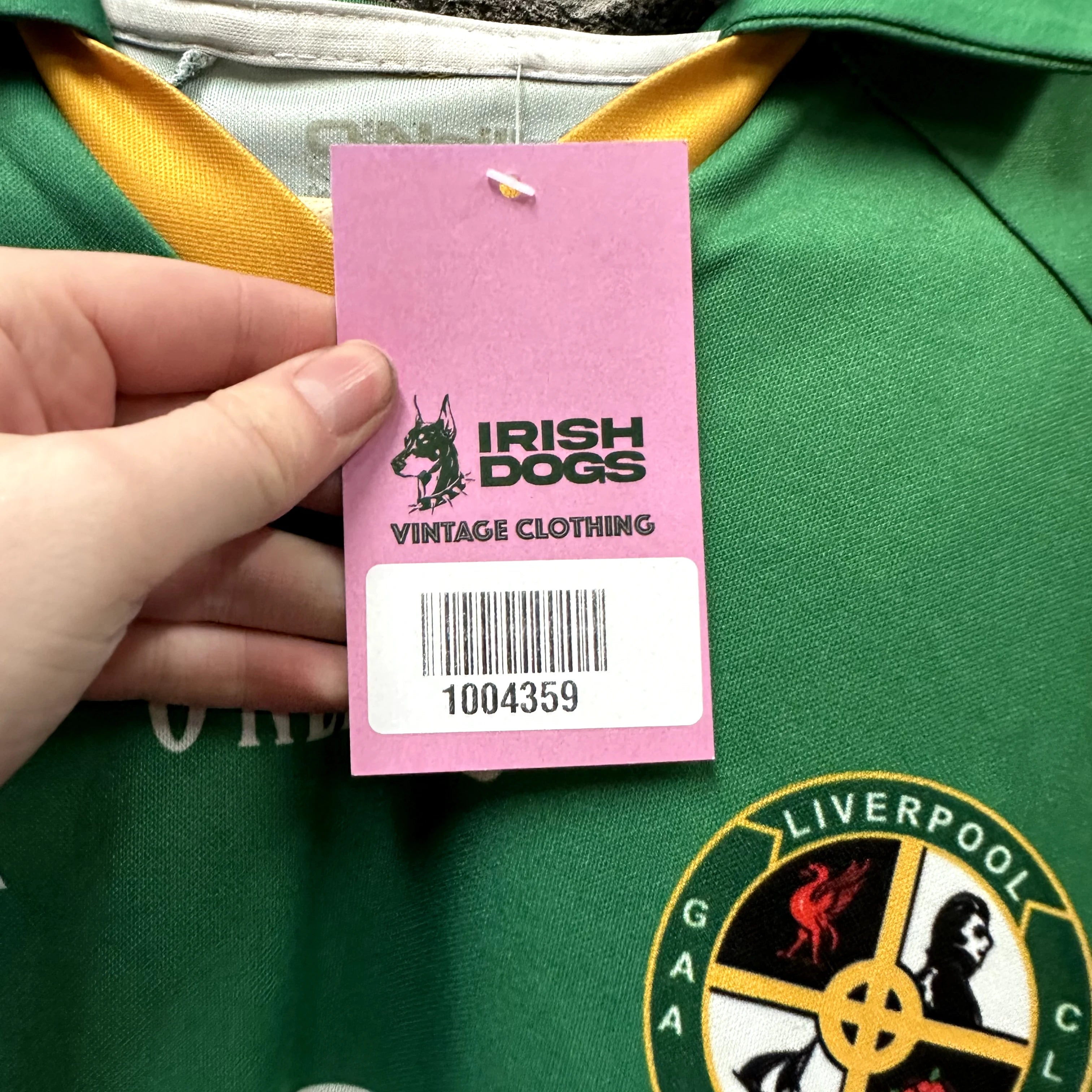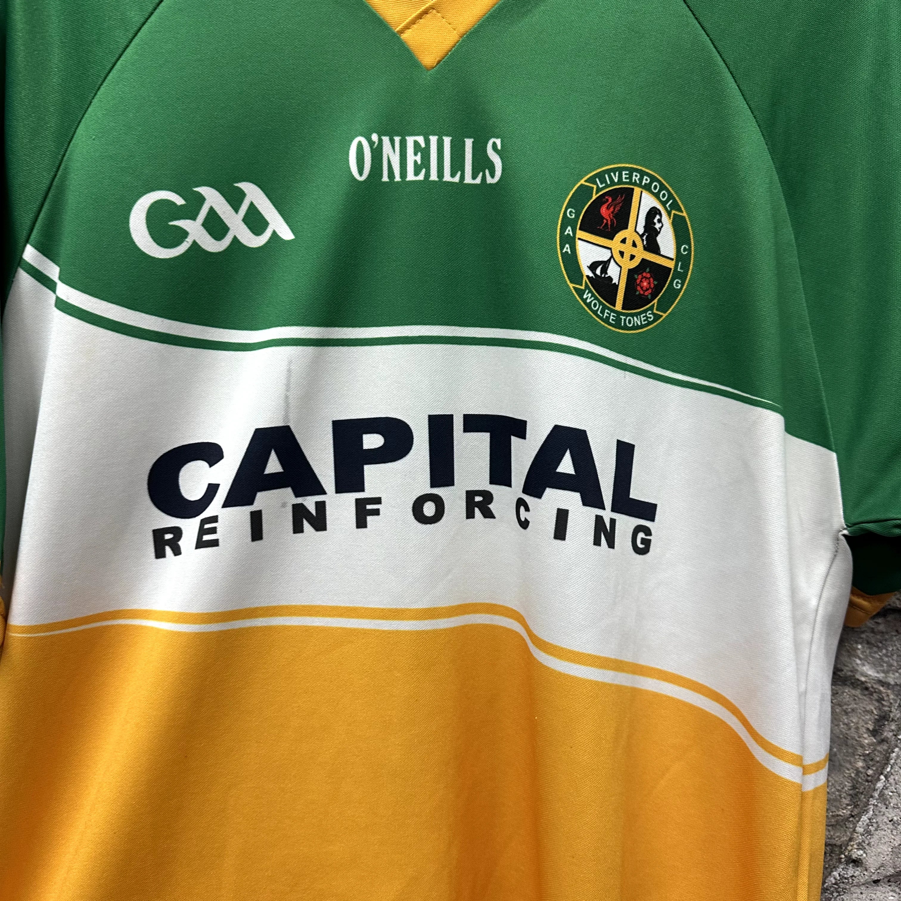 Product details: Green, white, and gold color block GAA jersey with Liverpool Wolfe Tones crest, sponsor and GAA branding, raglan sleeves, Irish language embellishments, and classic O'Neills collar; KOOLITE fabric. Brand: O'neills.| Label Size | |