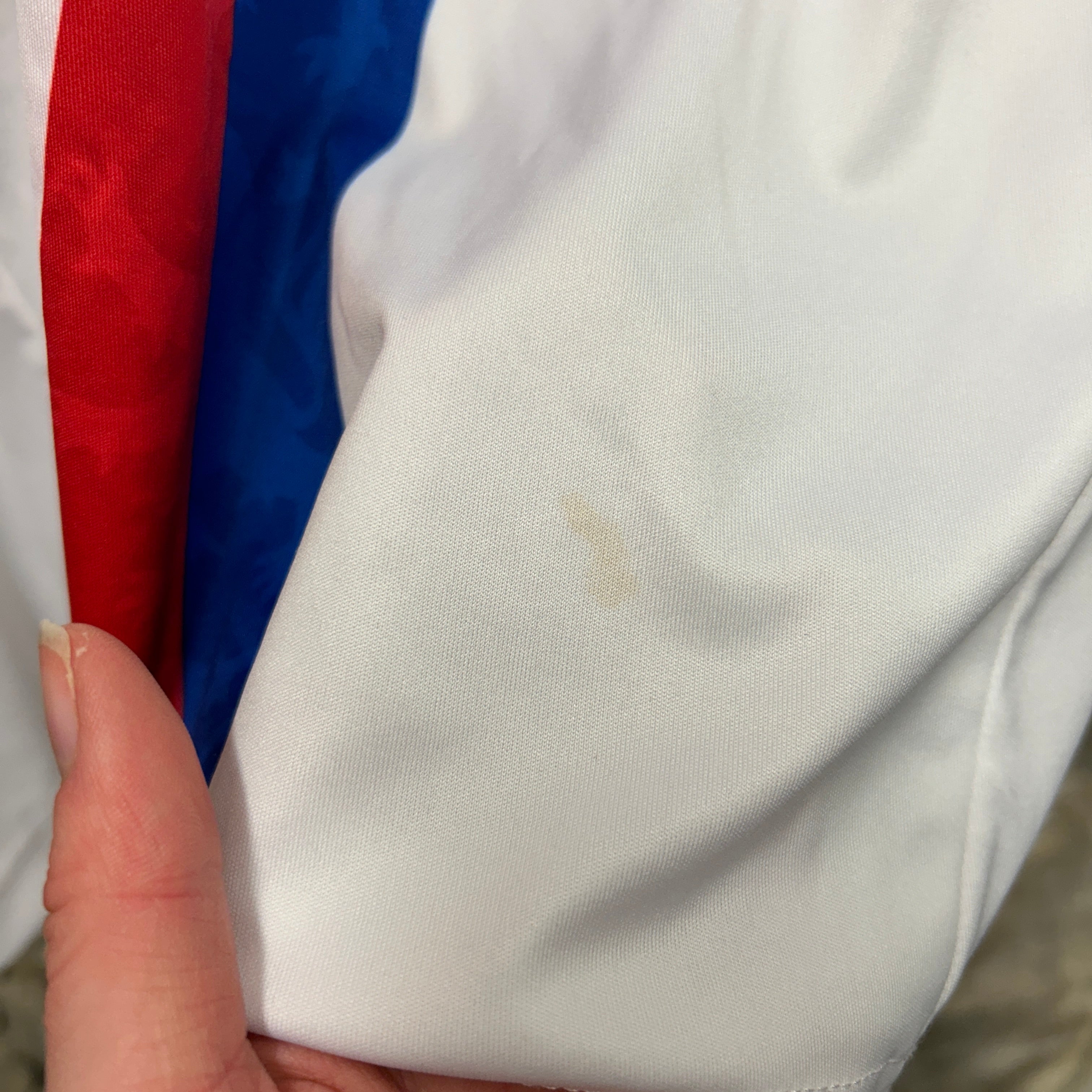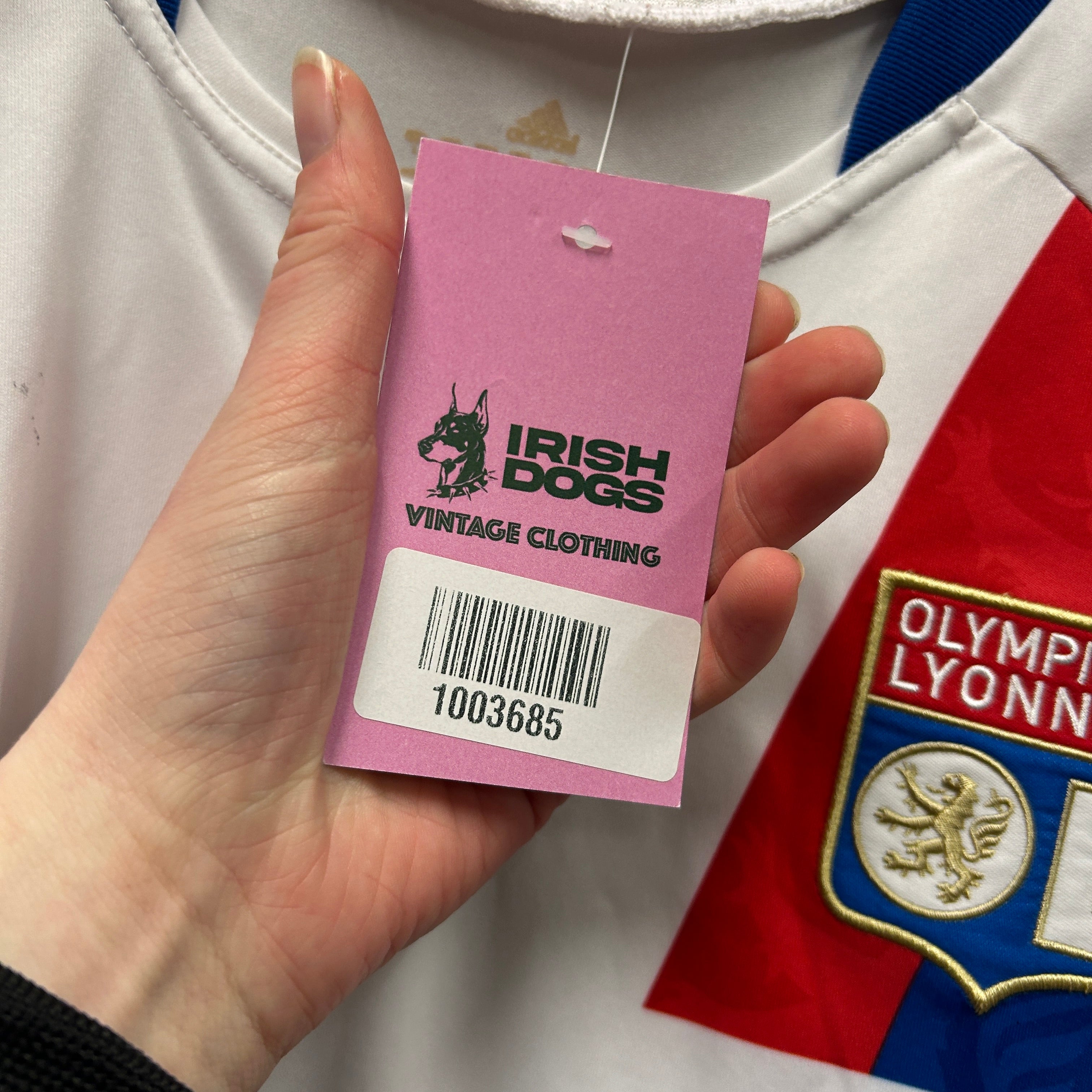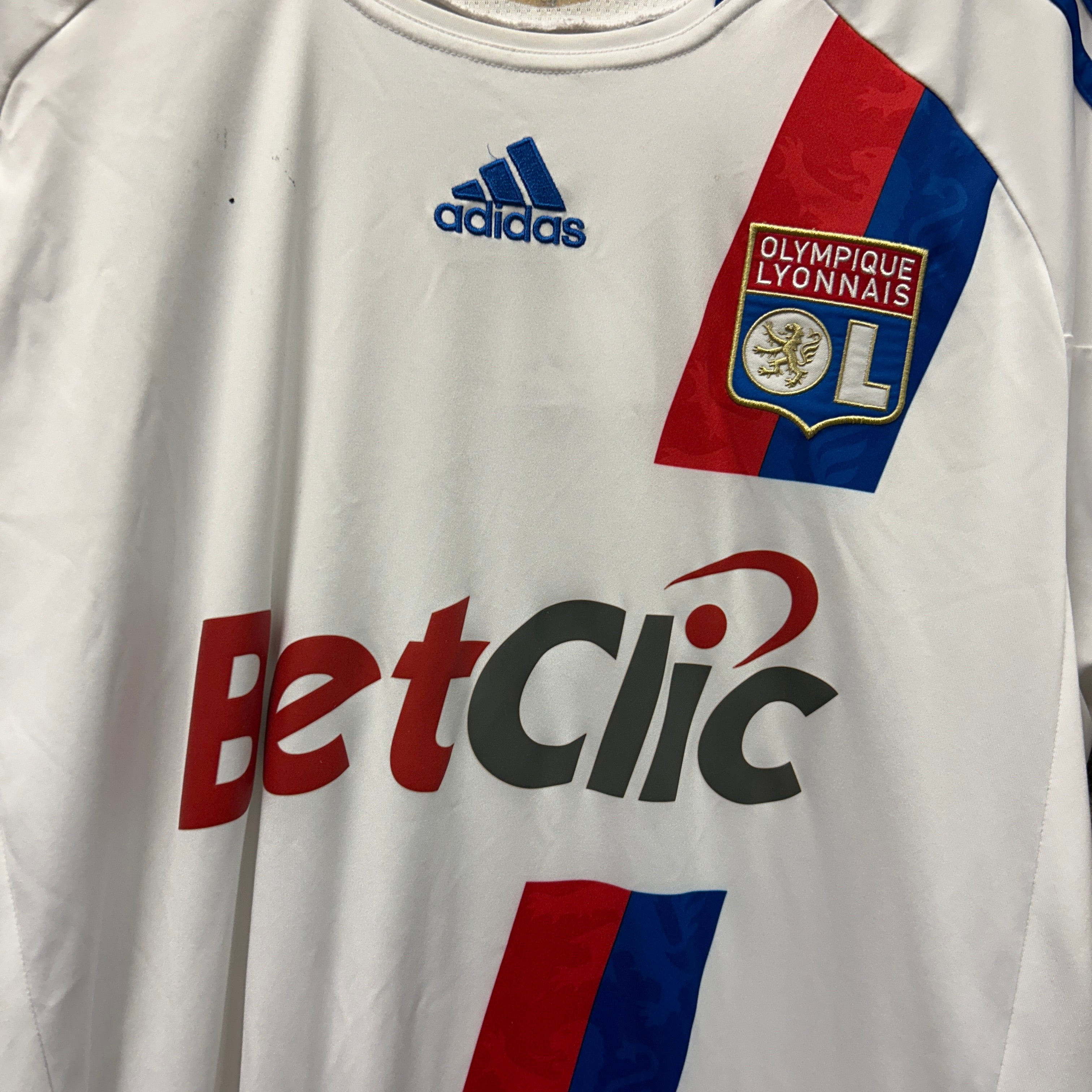 Product details: Adidas Olympique Lyonnais (OL) football shirt with BetClic sponsor print, embroidered Adidas logo and club crest, blue 3-stripe shoulder tape, and red/blue diagonal graphic panels with subtle tonal patterning. ClimaCool performance fabric with mesh ventilation at hem/inner collar. Anniversary-style inner collar print reading 1950–2010. Visible minor marks/spotting on the white fabric in close-ups. Brand: Adidas.| Label Size | |