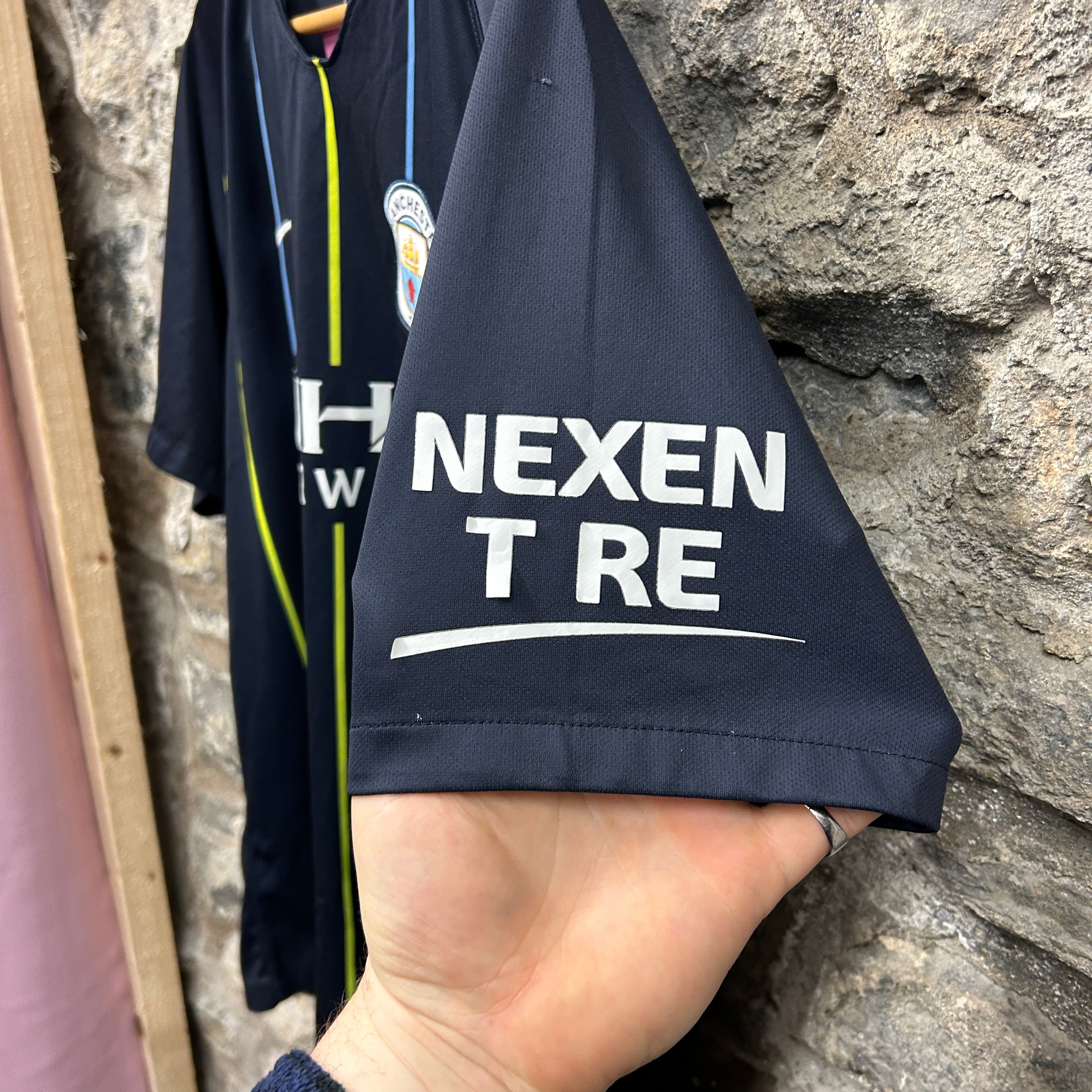 Product details: Manchester City Nike football shirt in dark navy with vertical pinstripes in sky blue and neon yellow. V-neck raglan cut with woven/embroidered club crest on chest, white Nike swoosh, large ETIHAD AIRWAYS sponsor print, and NEXEN TIRE sleeve sponsor. Authenticity patch at hem shows season marking “2018”. Lightweight performance knit/mesh feel; shop swing tag notes size XL and approx measurements A=57cm, L=76cm. Brand: Nike.| Label Size | |