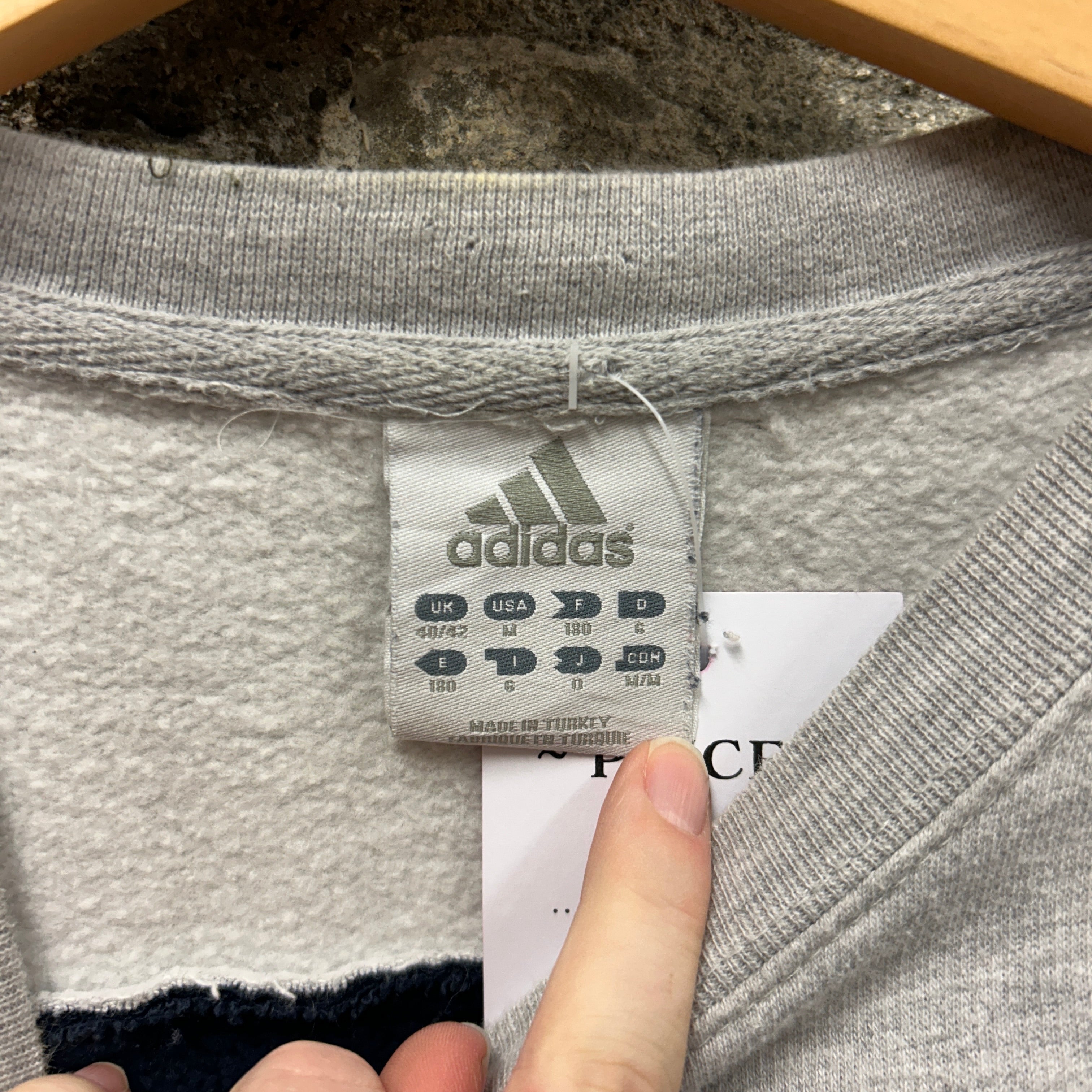 Product details: Adidas crewneck sweatshirt in grey marl with navy curved/swoosh colour-block panelling on front and sleeves. Small embroidered adidas wordmark + 3-bar logo on chest. Ribbed collar/cuffs/hem; soft brushed fleece interior. Made in Turkey size tag visible. Brand: Adidas.| Label Size | |