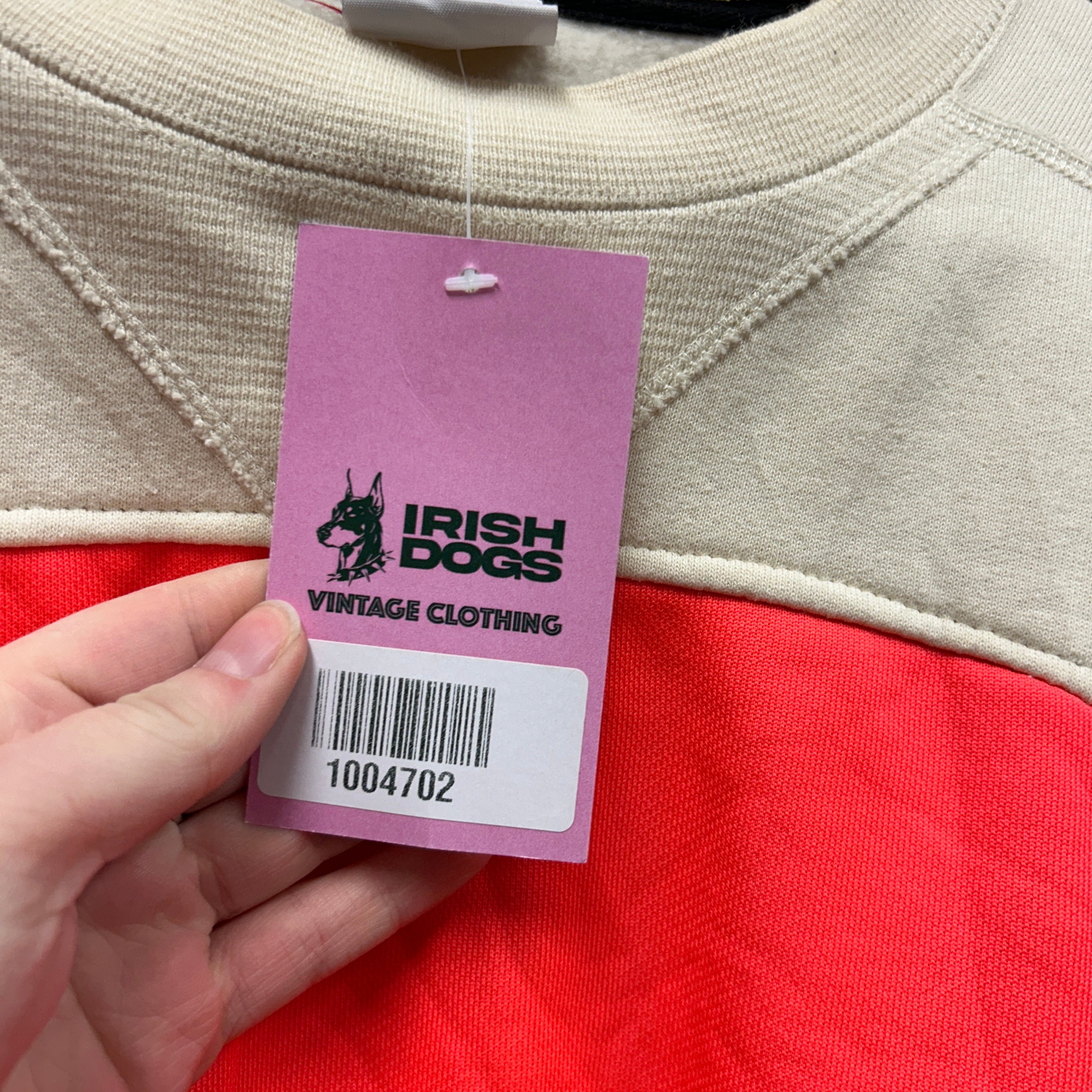 Product details: Champion crewneck sweatshirt in beige with oversized bright red applique/panel graphic across the front and matching red elbow/upper-sleeve panels; small embroidered Champion “C” logo on chest; ribbed collar, cuffs and hem; soft fleece-lined interior. Brand: Champion.| Label Size | |