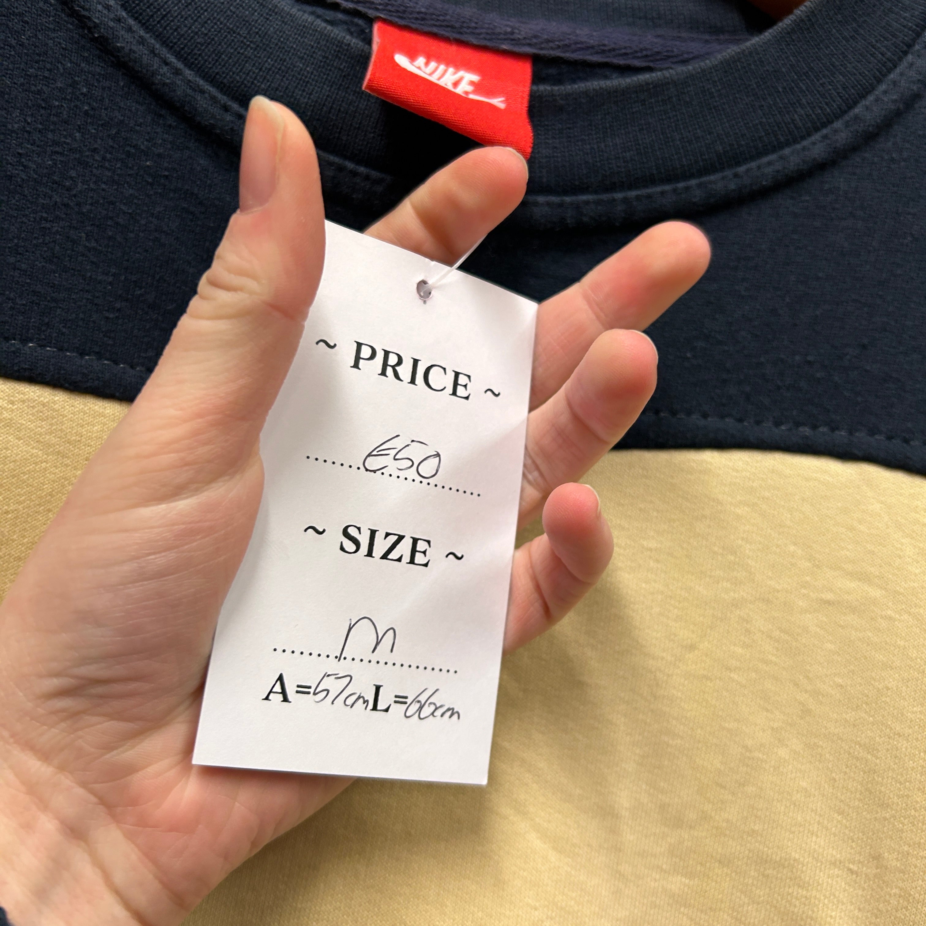 Product details: Nike crewneck sweatshirt with contrast beige panel on front and matching beige elbow/arm patches; small red embroidered Swoosh on chest; ribbed collar, cuffs and hem; fleece-backed sweatshirt fabric. Brand: Nike.| Label Size | |