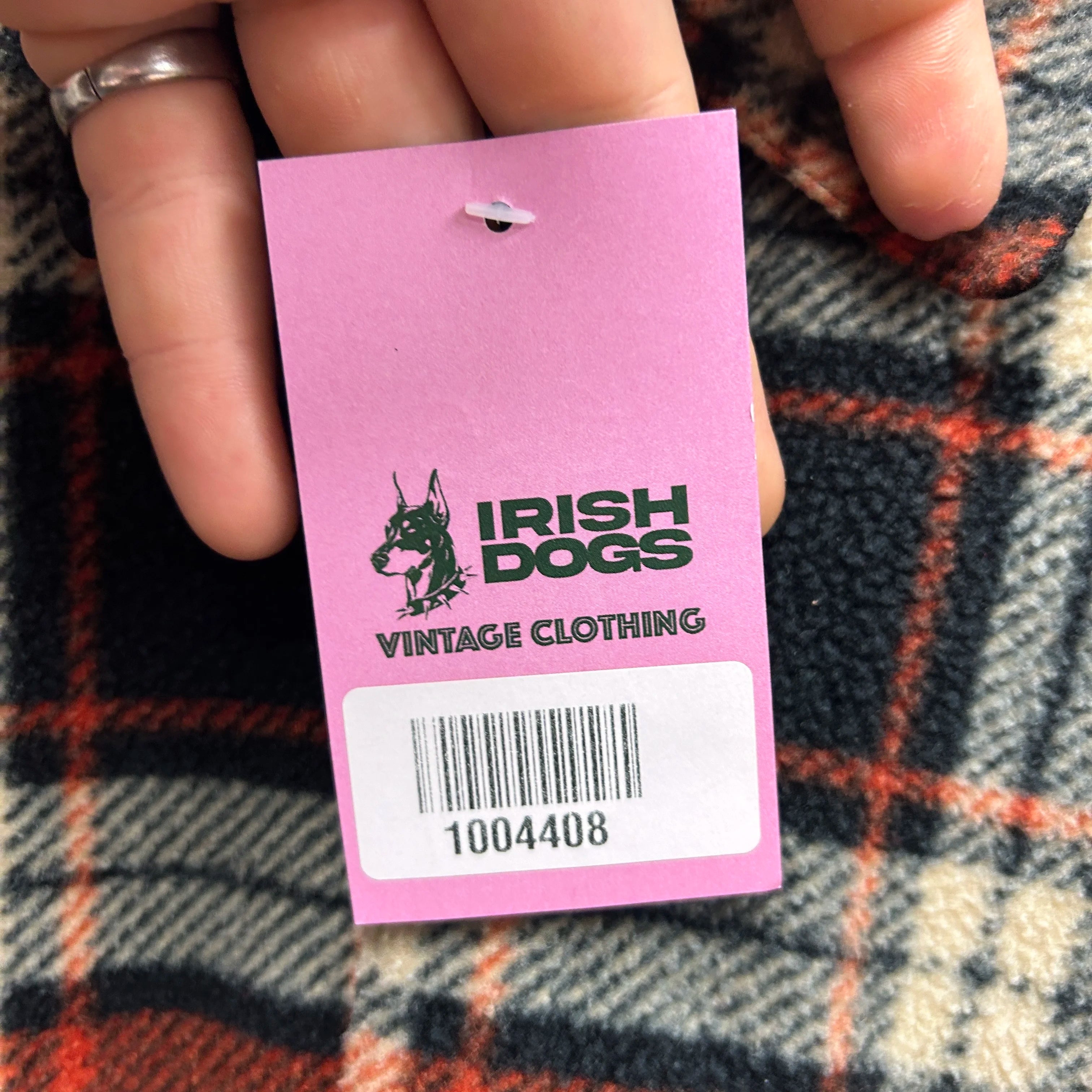 Product details: Rust brown, black, and cream large-check plaid design. Buttons down front and on cuffs, two chest flap pockets, relaxed XXL fit. Visible wear with some minor paint spots and small marks. Label: Atlas For Men, size XXL. Tag from IRISH DOGS vintage shop. Brand: Atlas For Men.| Label Size | |