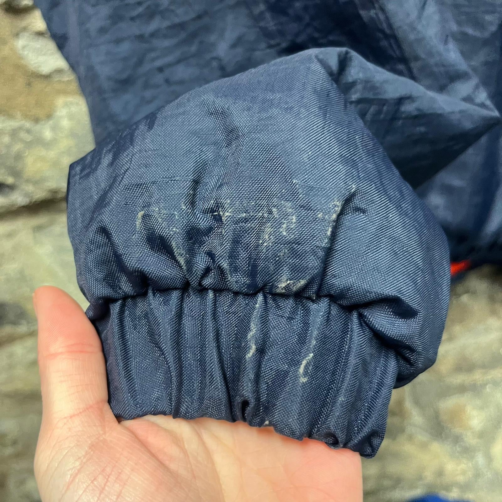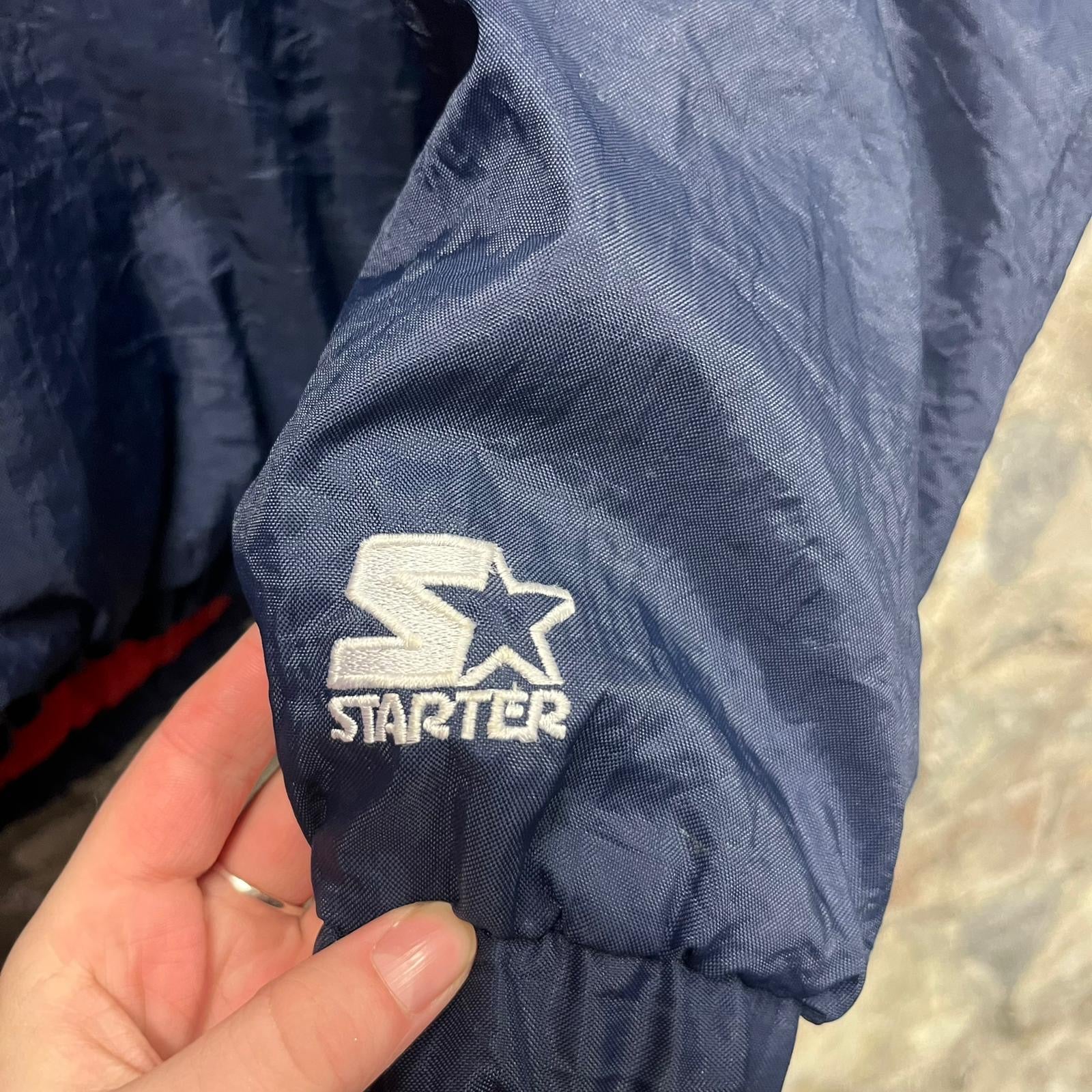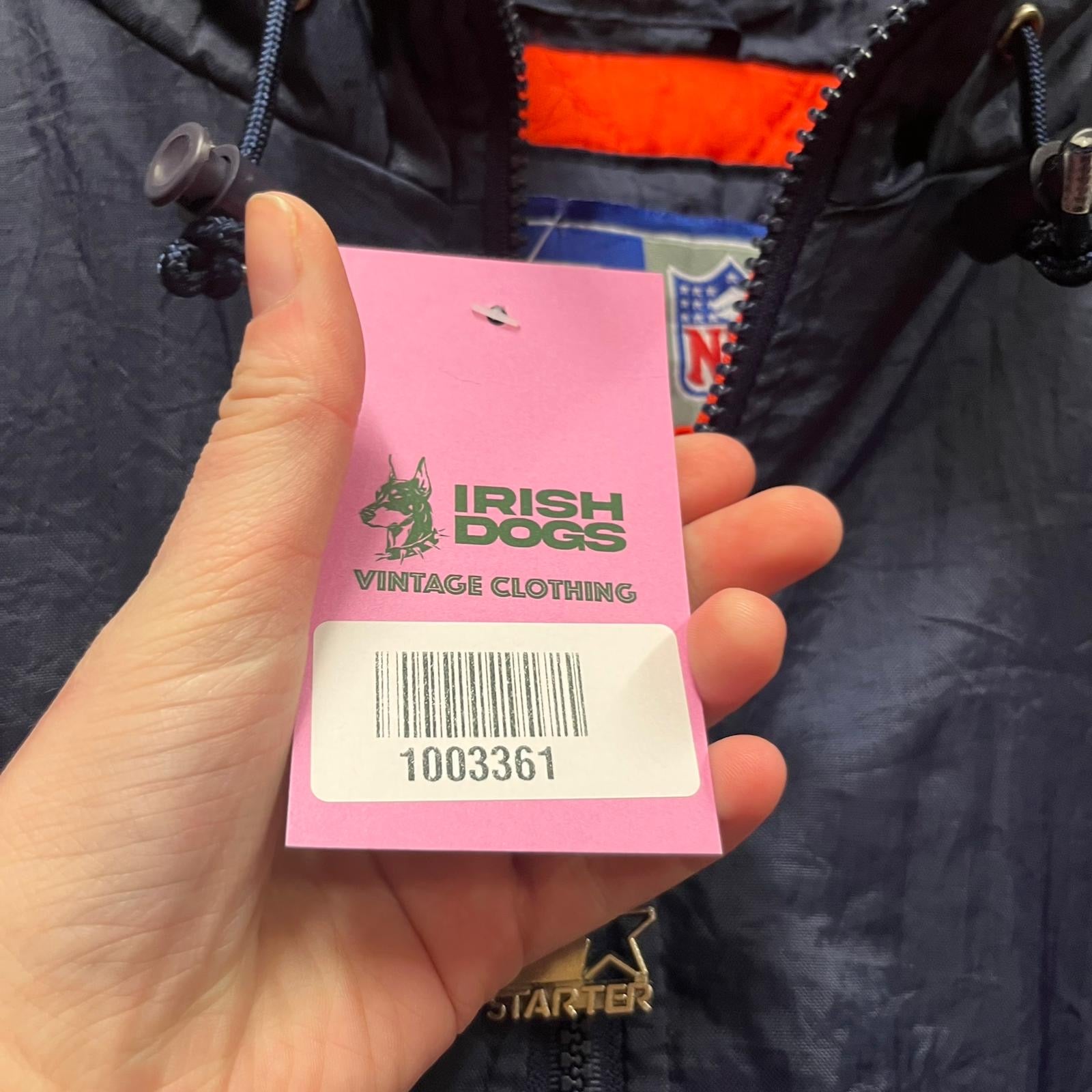 Product details: Vintage Starter x NFL Chicago Bears hooded pullover puffer/anorak style with half-zip front and oversized kangaroo flap pocket. Navy nylon shell with bold orange and white colorblock sleeve panels, embroidered BEARS wordmark on front pocket, large stitched Chicago Bears “C” bear-head back logo, NFL shield patch on sleeve, and Starter embroidery at cuff plus metal Starter zipper pull. Elasticated cuffs and hem; light surface wear/marking visible at cuff in photos. Brand: Starter.| Label Size | |