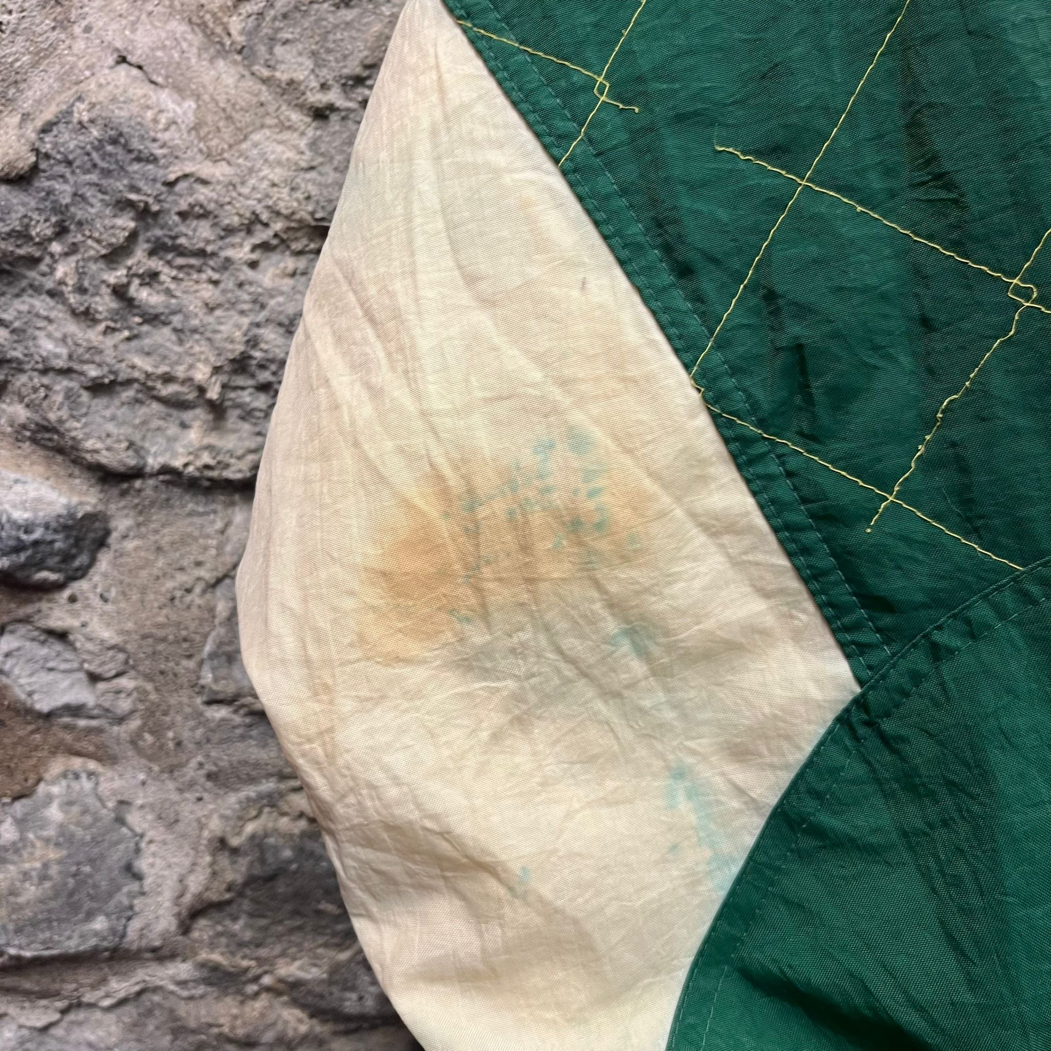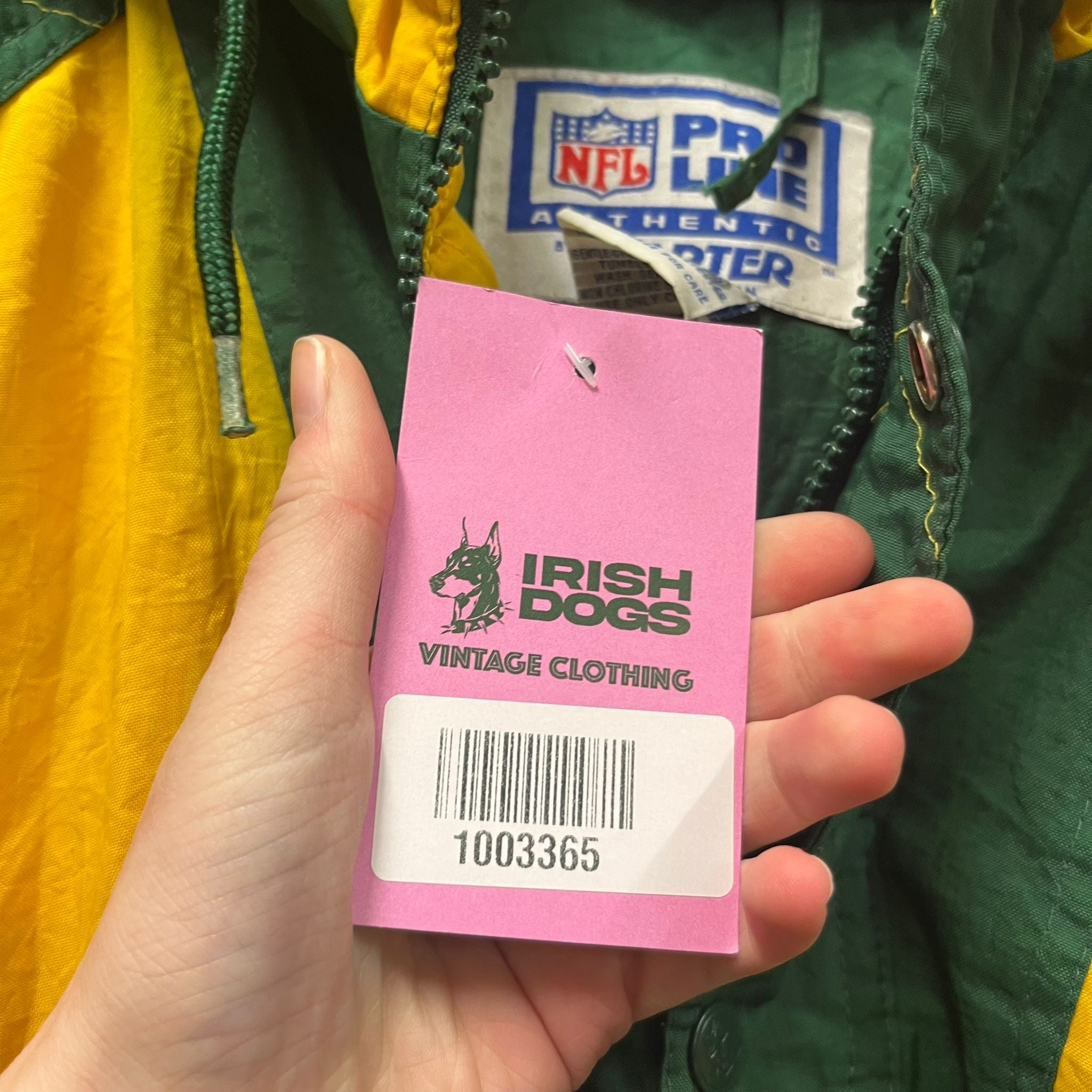 Product details: Vintage Green Bay Packers hooded puffer jacket with diamond-quilt stitching, green/yellow/cream color-block panels, snap + zip front, elastic cuffs/hem, embroidered Packers chest logo, large back "G" applique, NFL shield sleeve patch, and Starter logo embroidery at cuff/upper back. Visible staining/discoloration on the light/cream sleeve panels (shown in close-ups). Brand: Starter.| Label Size | |