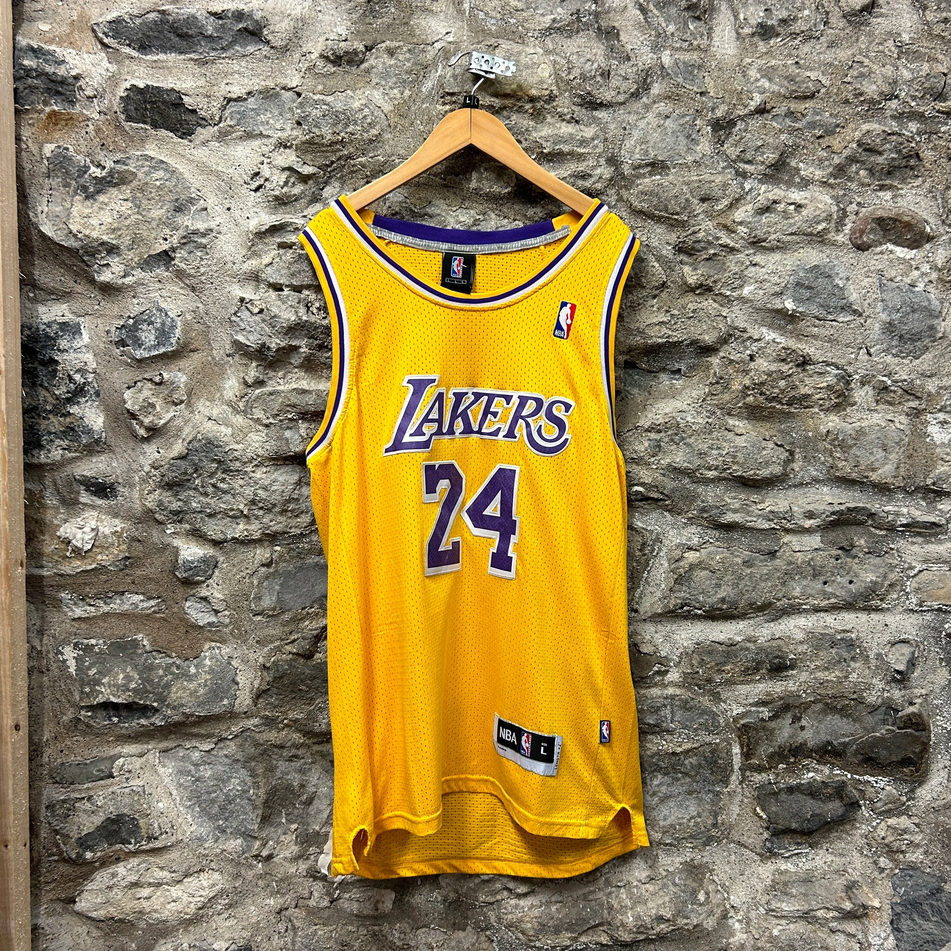 Product details: Los Angeles Lakers #24 'Bryant' jersey, yellow mesh with purple/white detailing, stitched team and player names/numbers, official NBA tags, size L with +2" length, visible armhole and hem design, minor signs of age and wear. Brand: .| Label Size | |