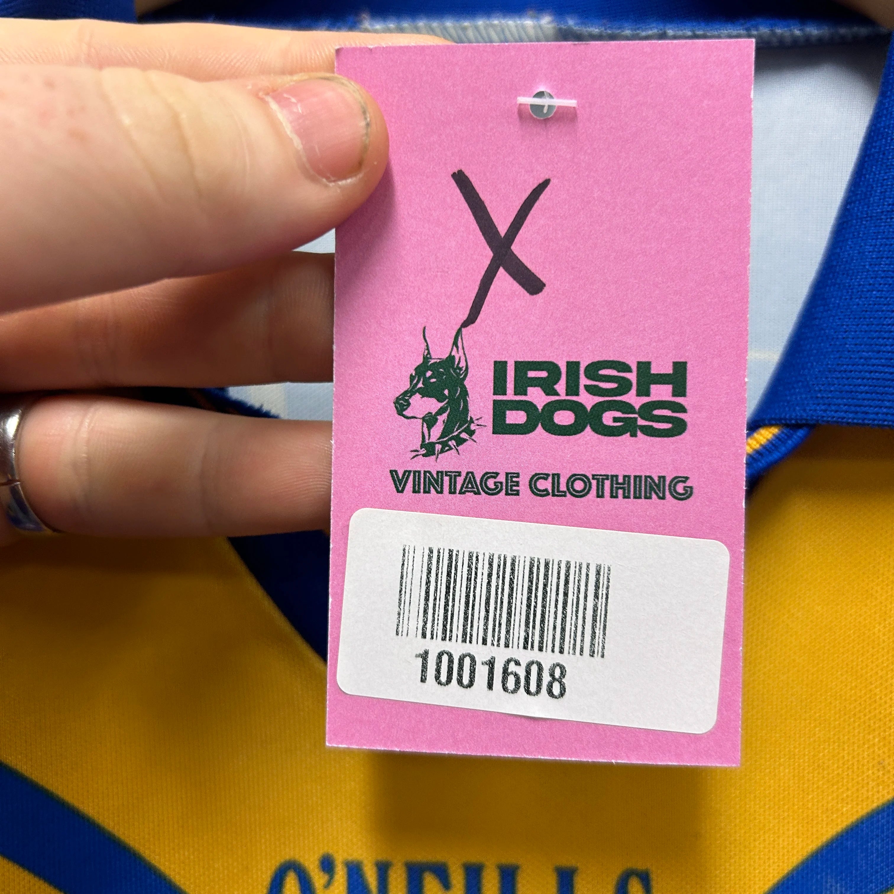Product details: 1990s O'Neills XL Longford GAA jersey in blue with yellow panels, crest and sponsor print (Longford Arms Hotel), embroidered sleeve and chest crests, classic ribbed collar with stripe, minor snags and marks as shown in close-ups. Brand: O'neills.| Label Size | |