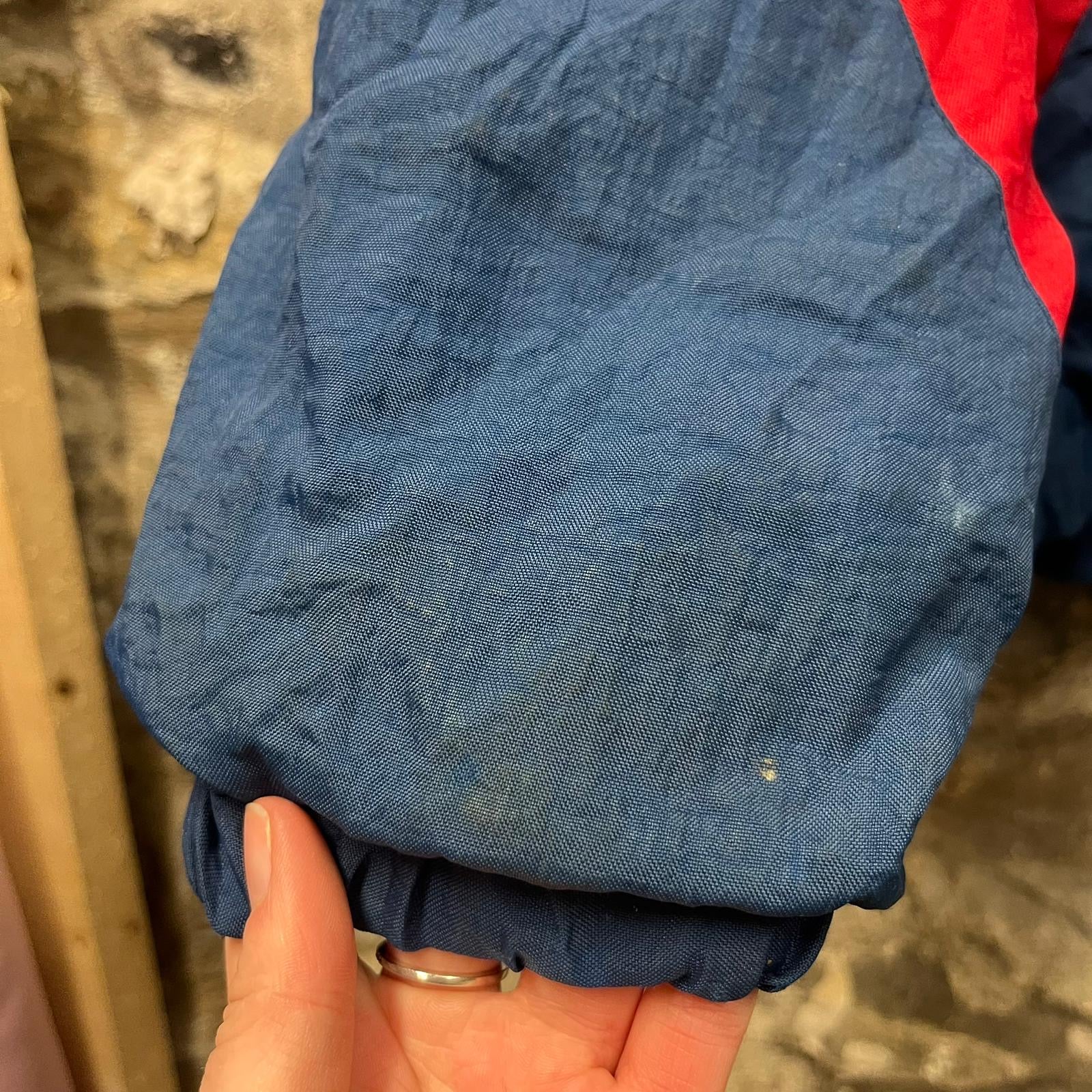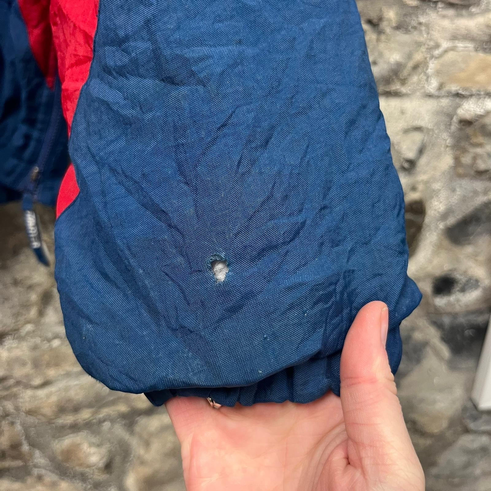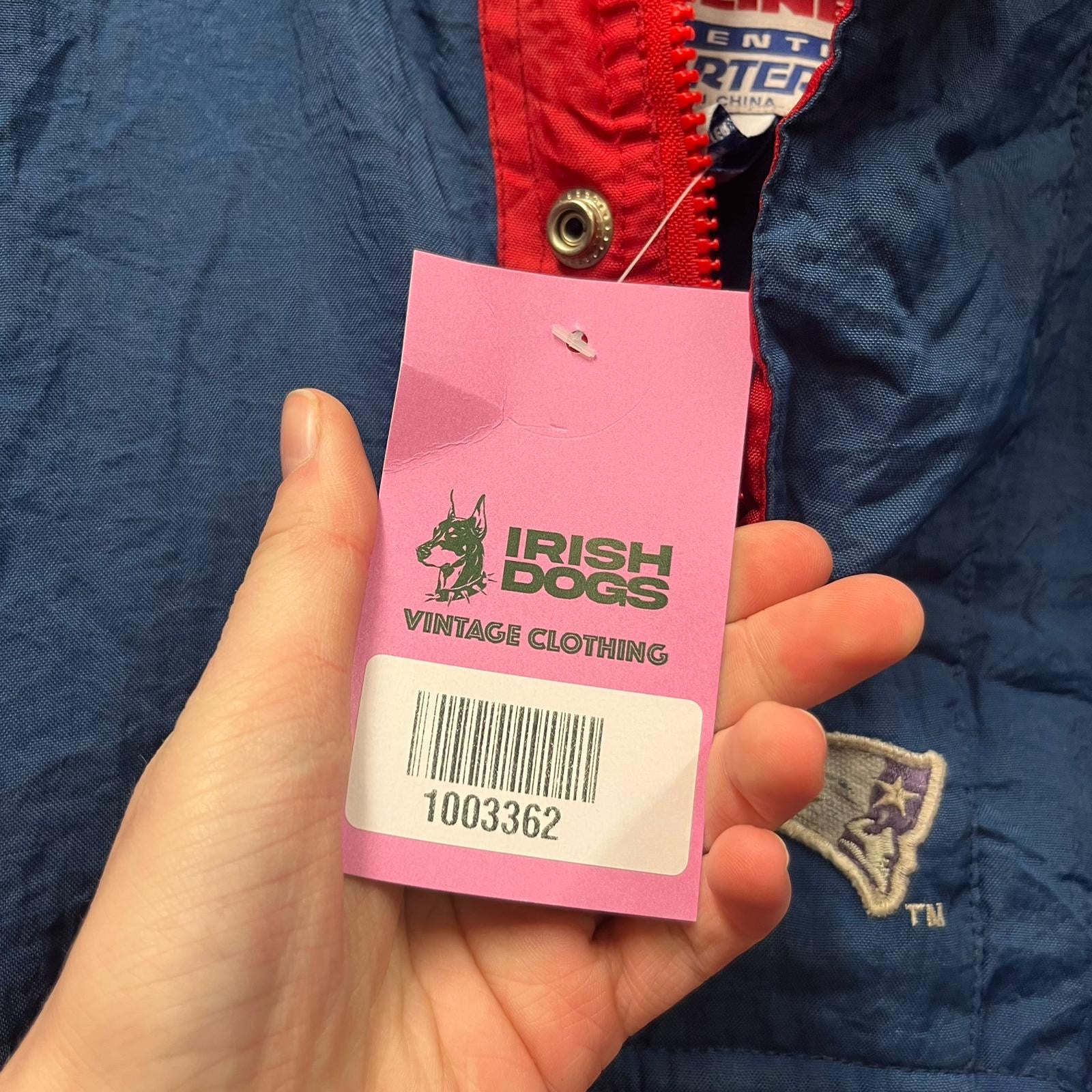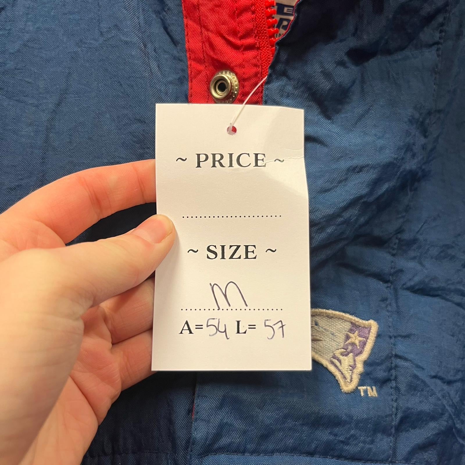 Product details: Vintage NFL Pro Line by Starter New England Patriots pullover puffer-style jacket with hood; nylon shell with PU coating, quilted/insulated body, half-zip with snap placket, elastic cuffs/hem, large embroidered “PATRIOTS” front flap applique, embroidered Patriots logo at chest and large back logo, NFL Pro Line patch on sleeve, Starter logo embroidery on cuff. Noted wear: visible sleeve mark/spotting and a small hole on sleeve cuff area in photos. Brand: Starter.| Label Size | |