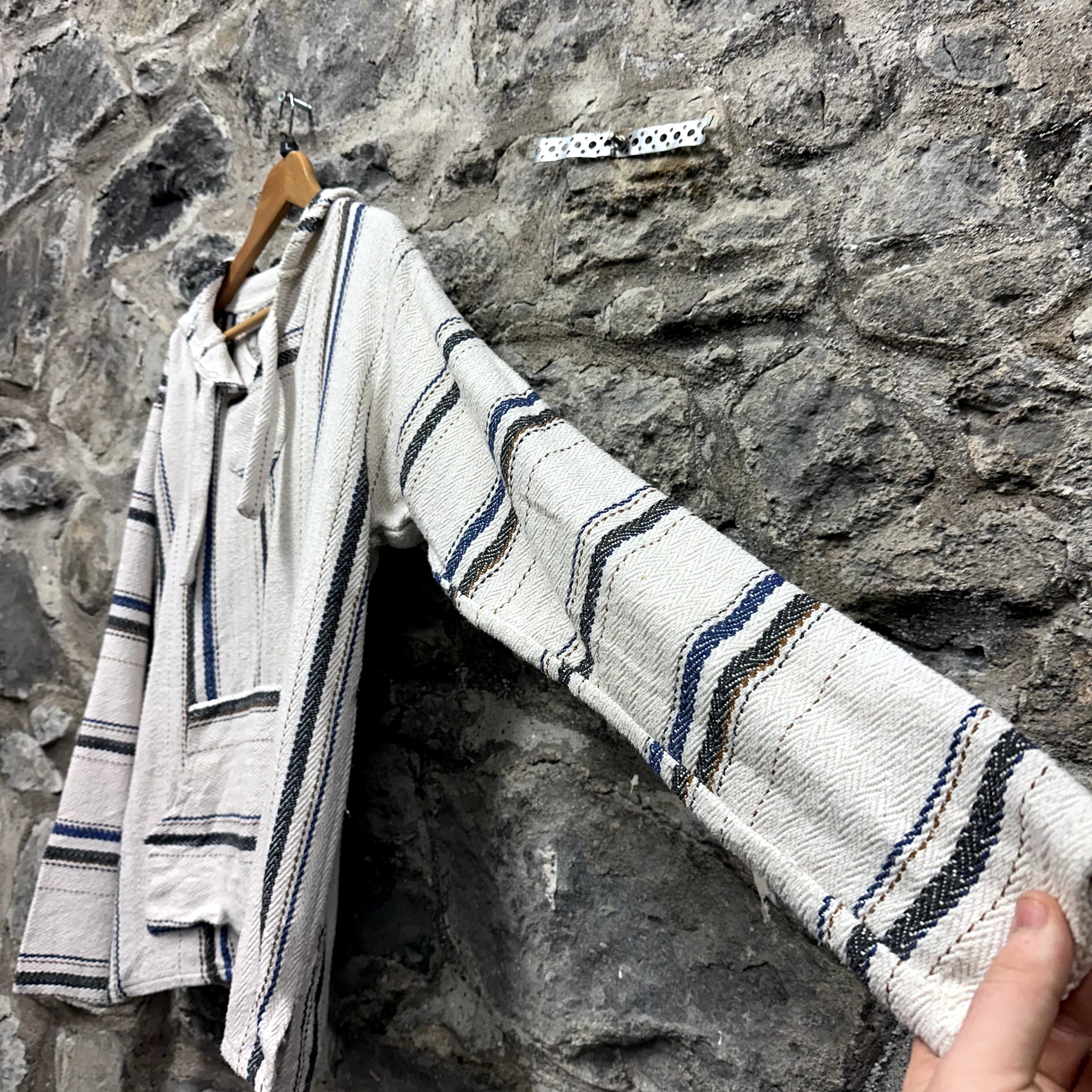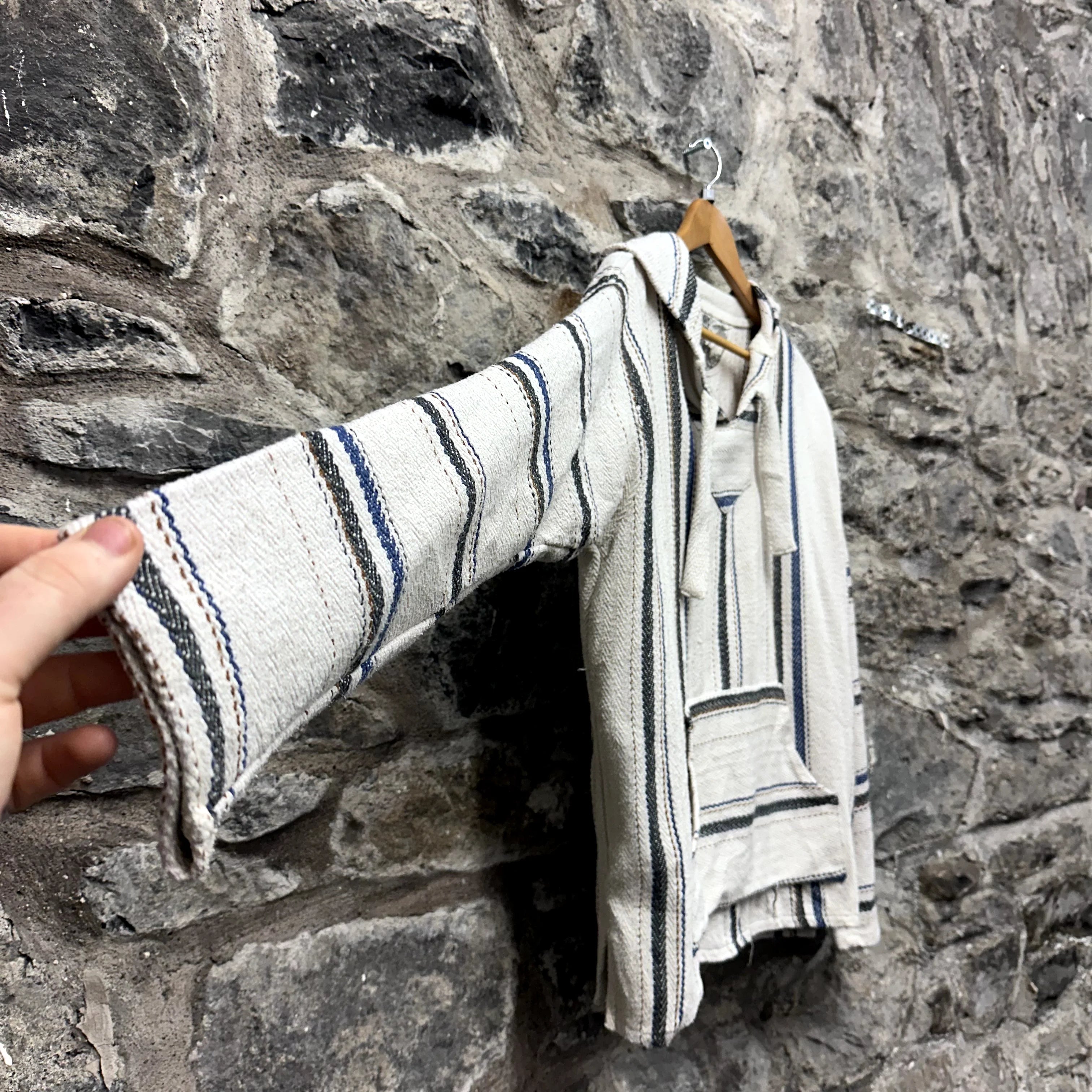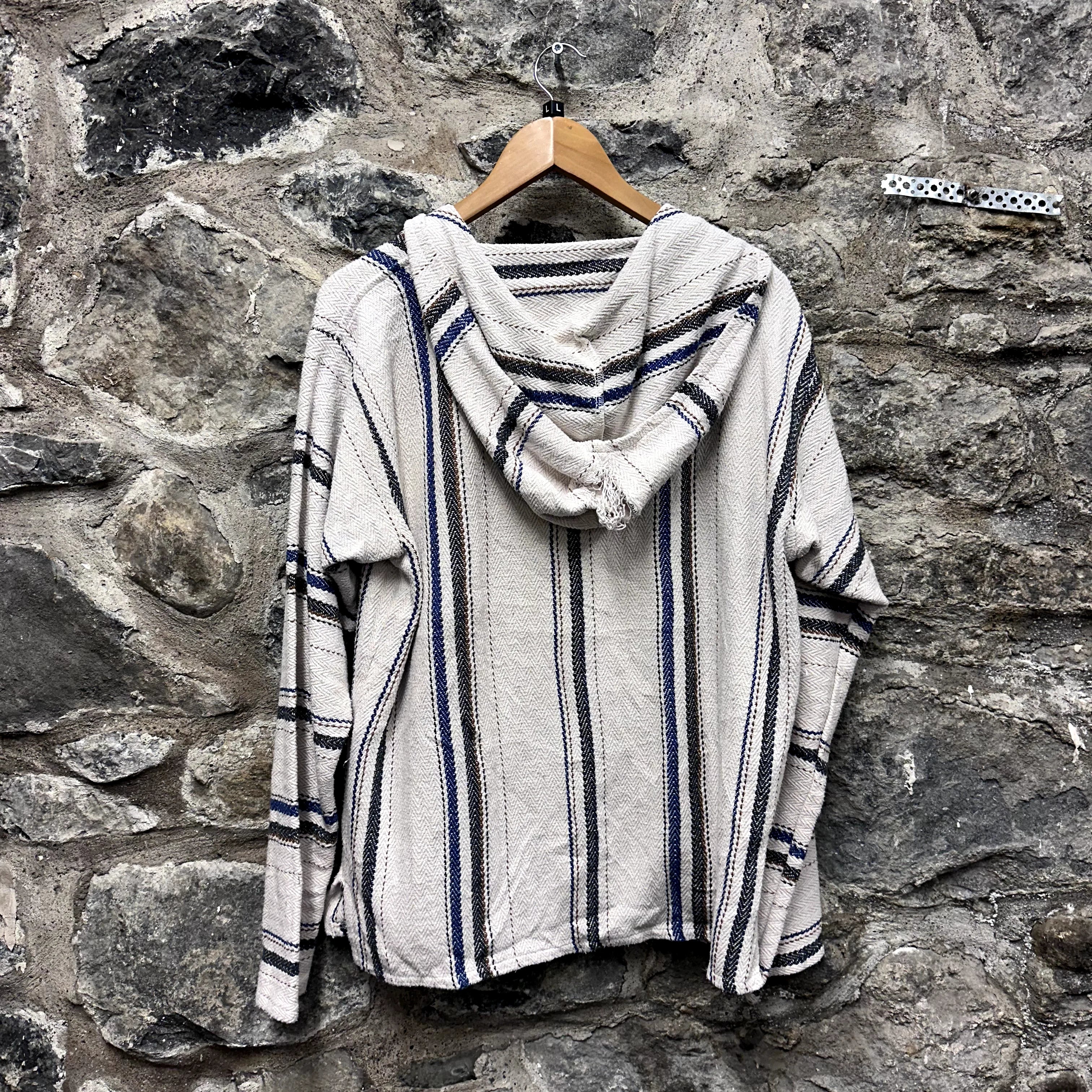 Product details: Beige with navy and black stripes, herringbone weave, drawstring hoodie, kangaroo pocket, fringe on hood, made in Mexico. Brand: Señor Lopez.| Label Size | |