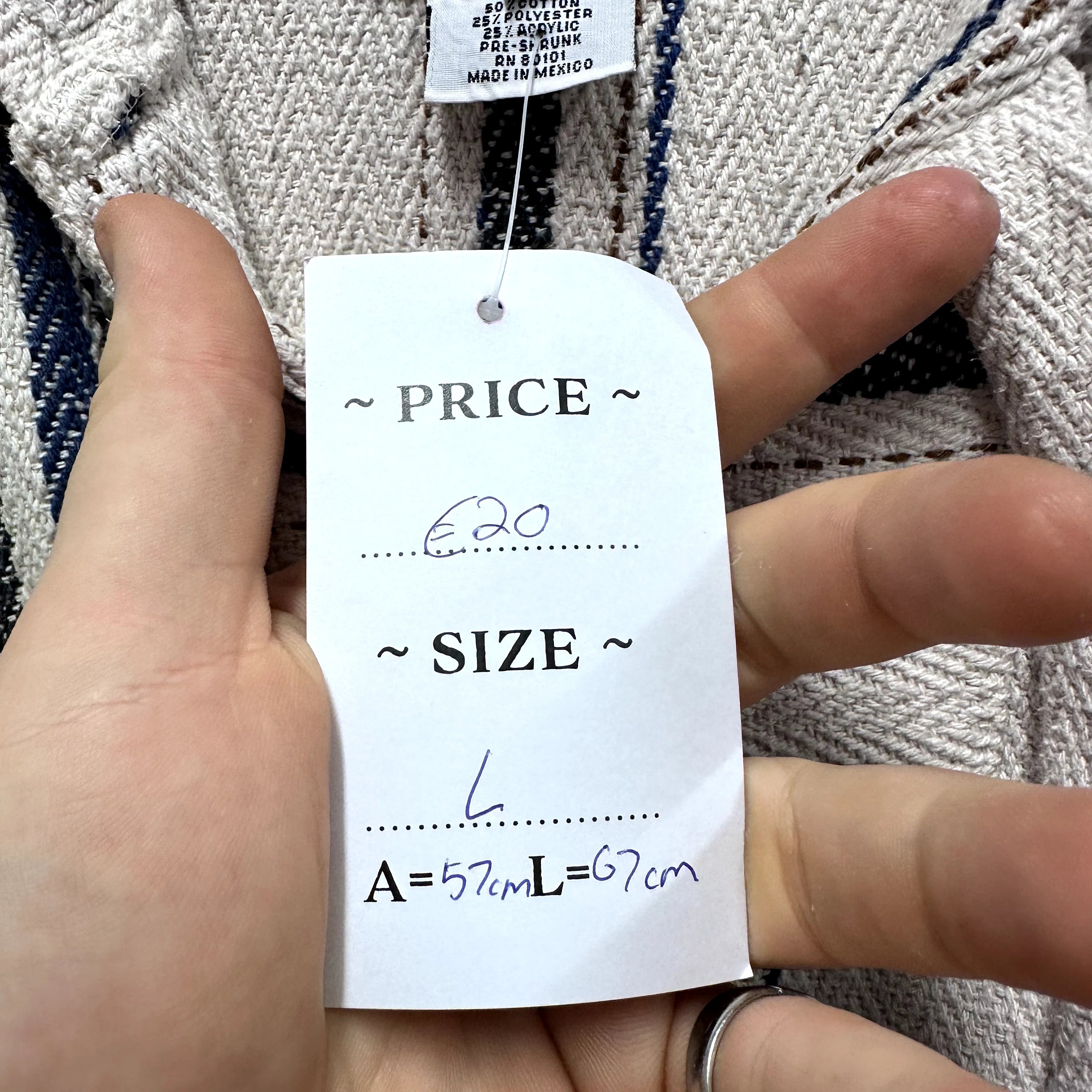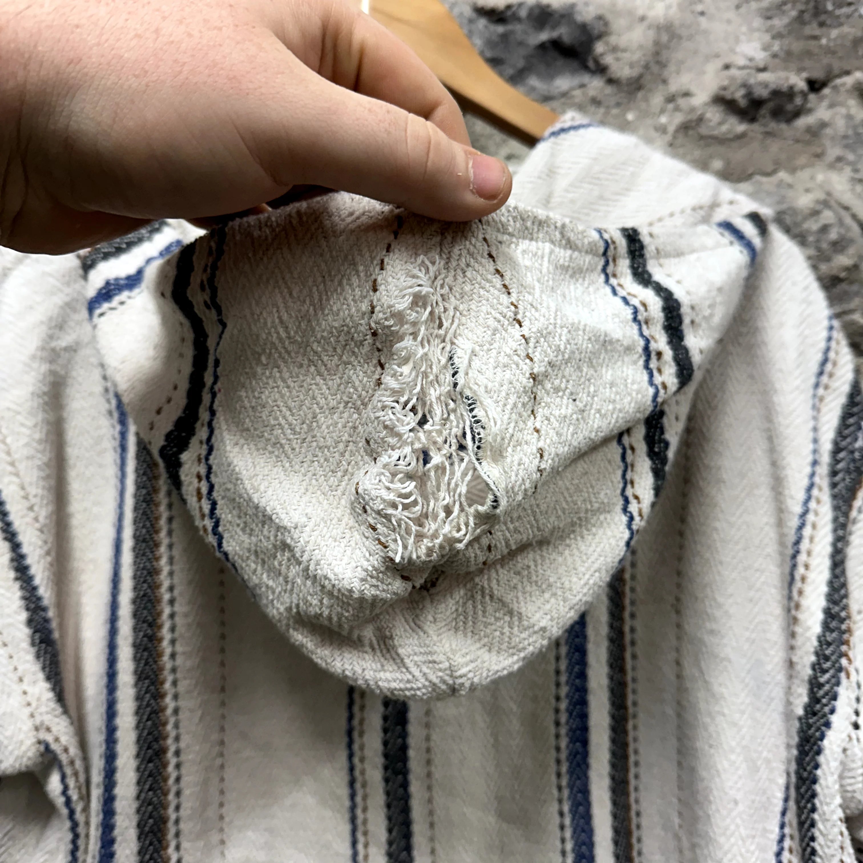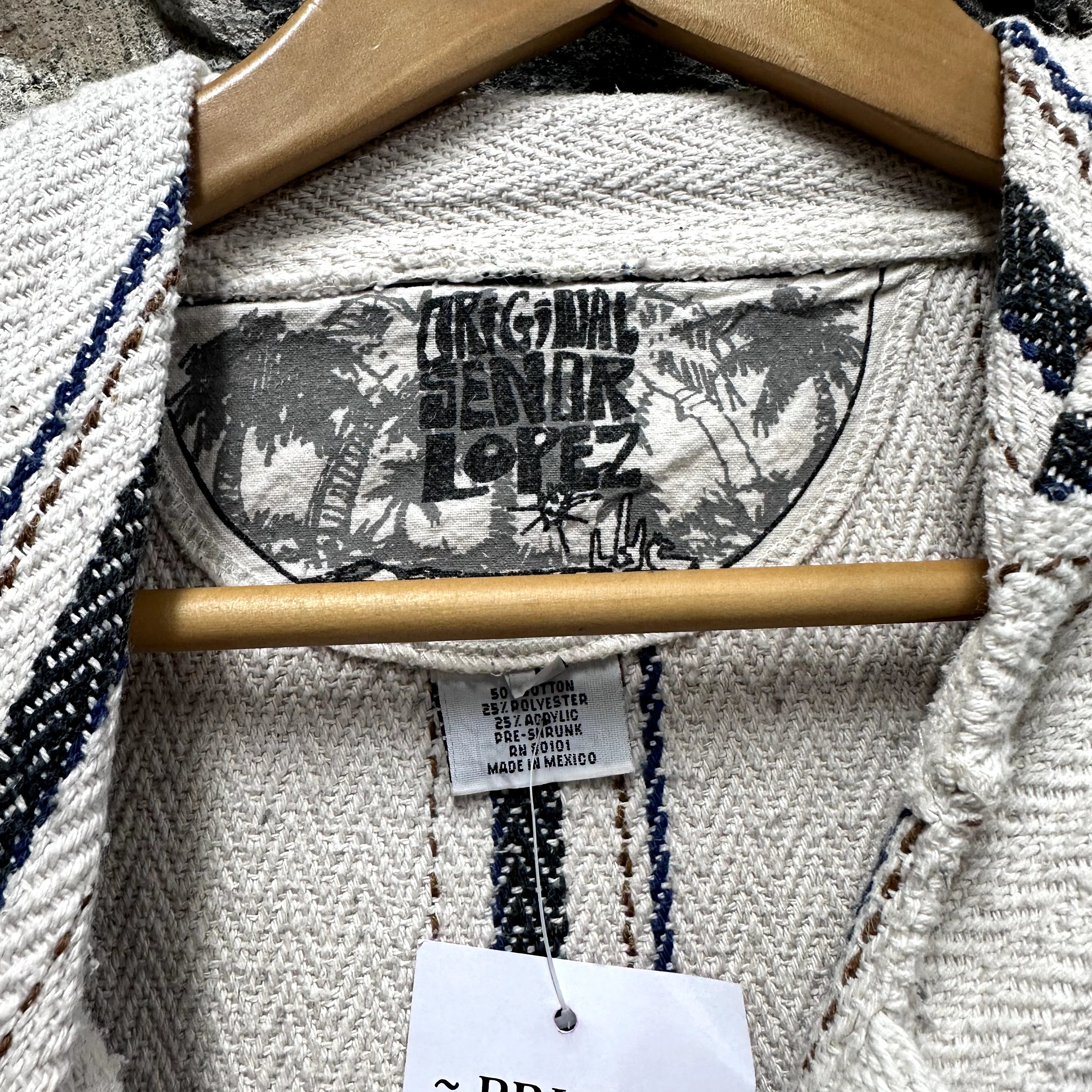 Product details: Beige with navy and black stripes, herringbone weave, drawstring hoodie, kangaroo pocket, fringe on hood, made in Mexico. Brand: Señor Lopez.| Label Size | |