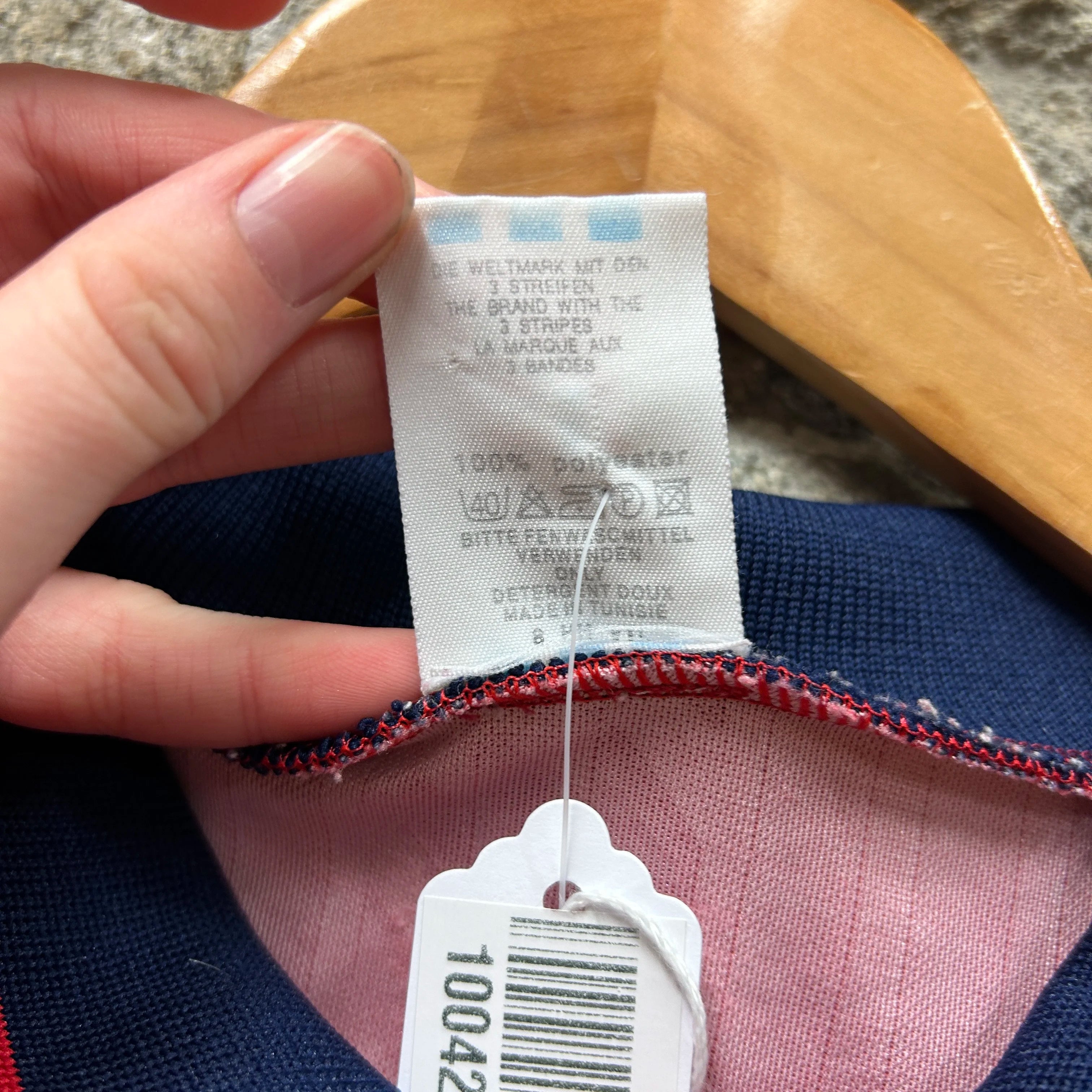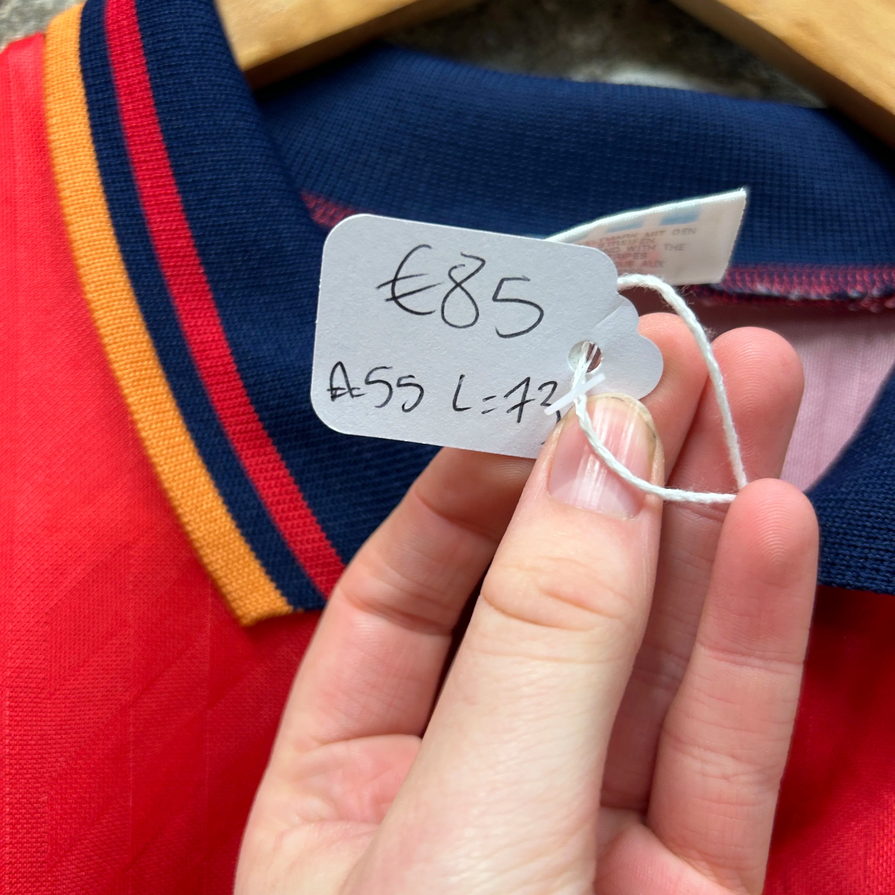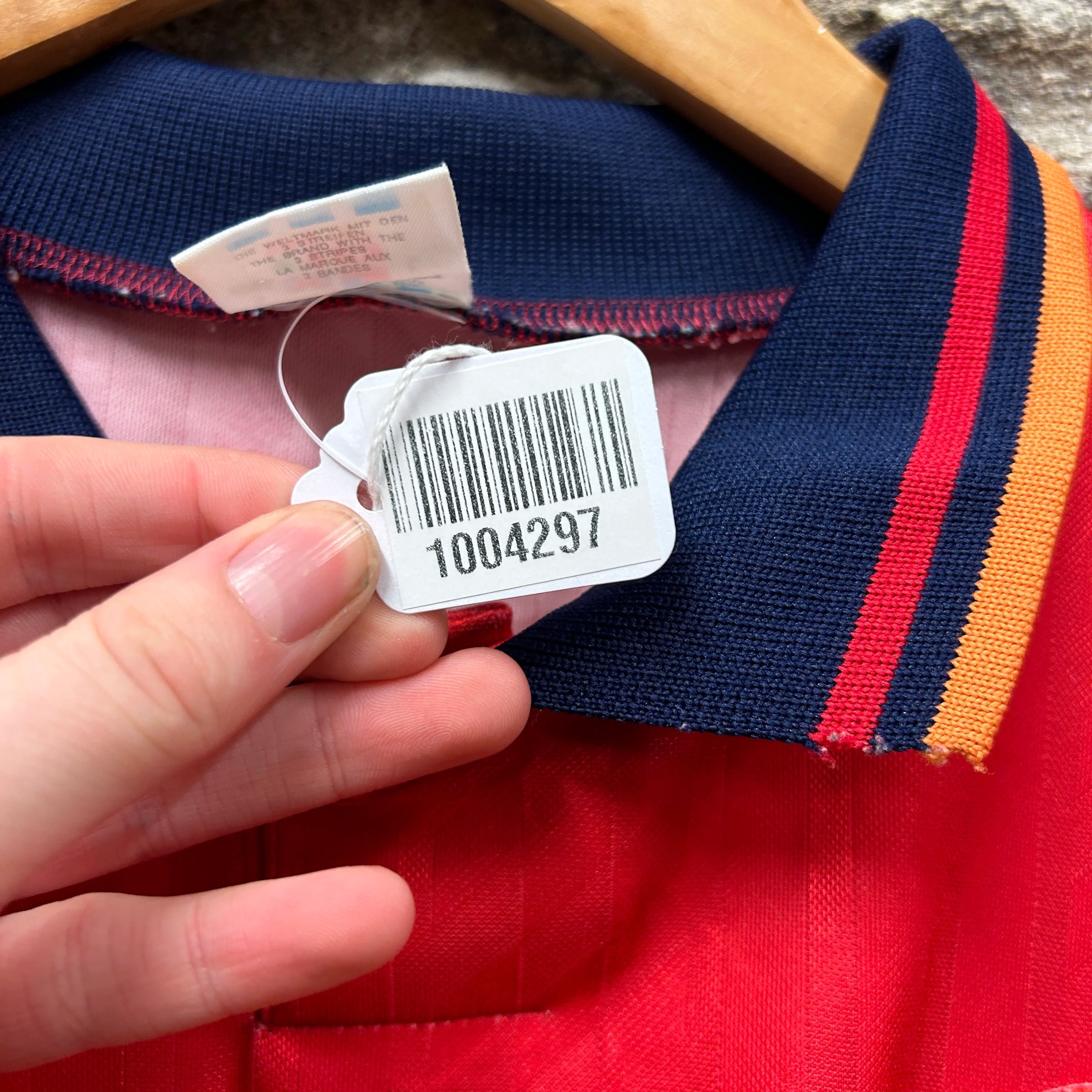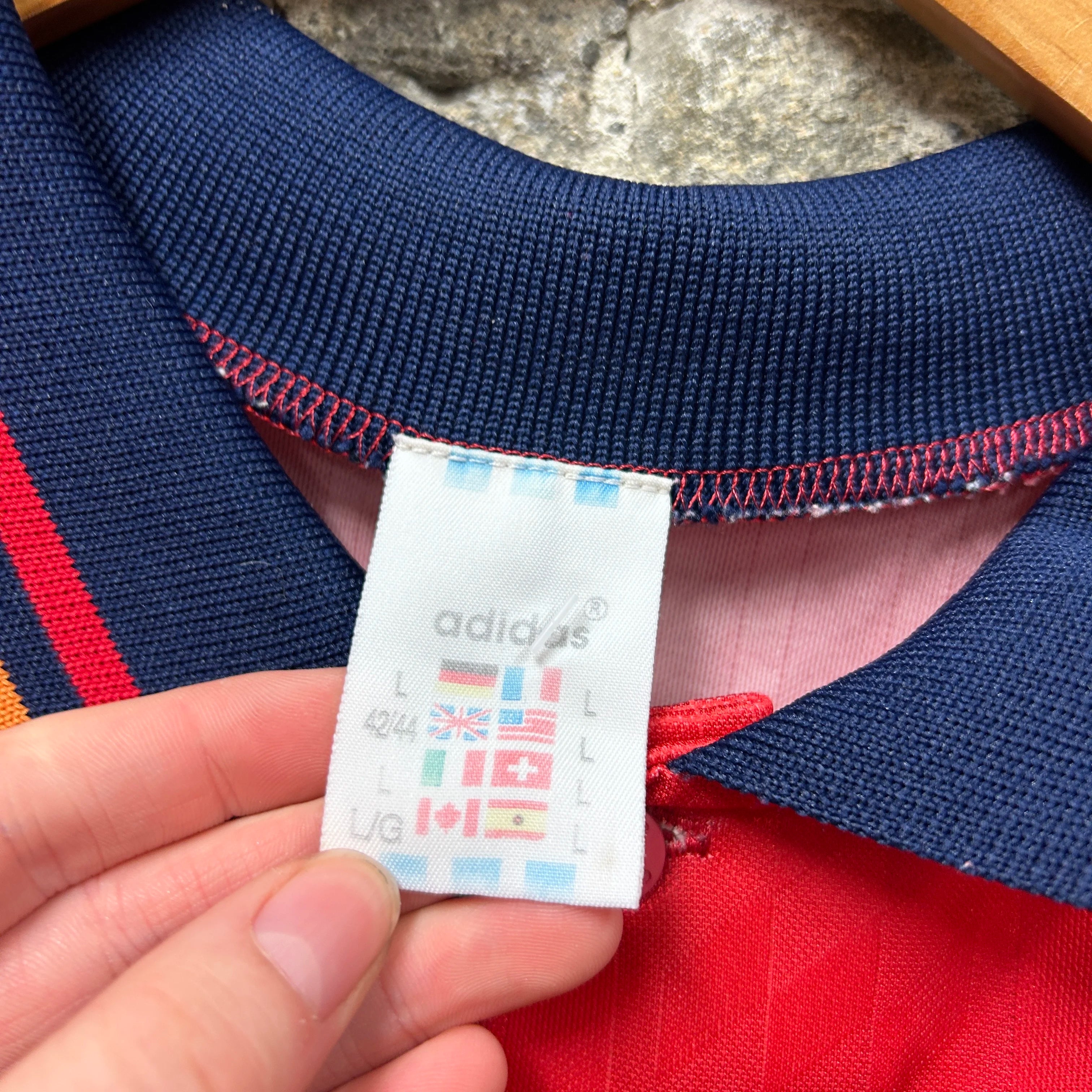 Product details: Red polyester football shirt, geometric navy/yellow print on left, embroidered Spain crest, Adidas branding, ribbed multi-stripe collar, tonal vertical stripe texture, 1990s design, some back wear. Brand: Adidas.| Label Size | |