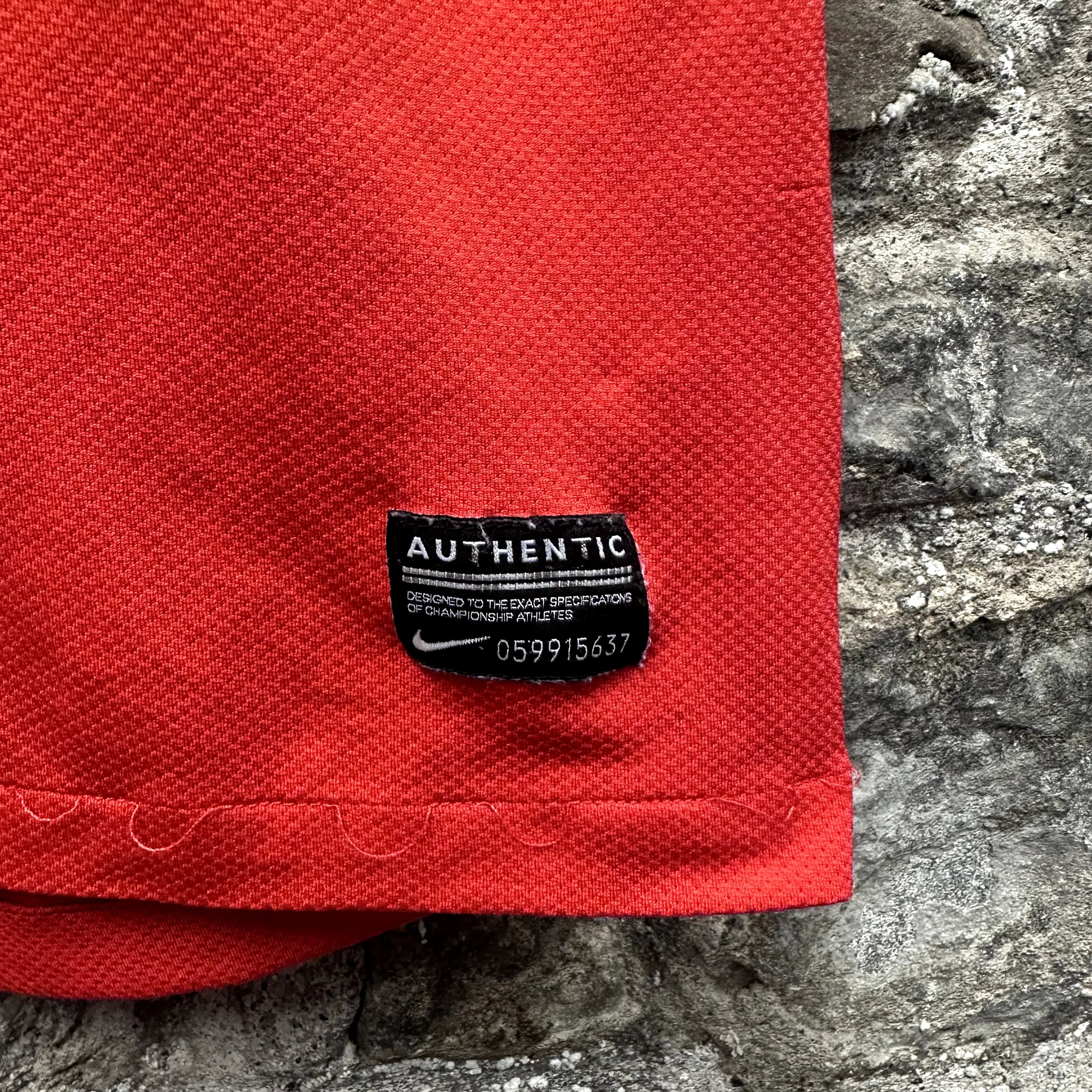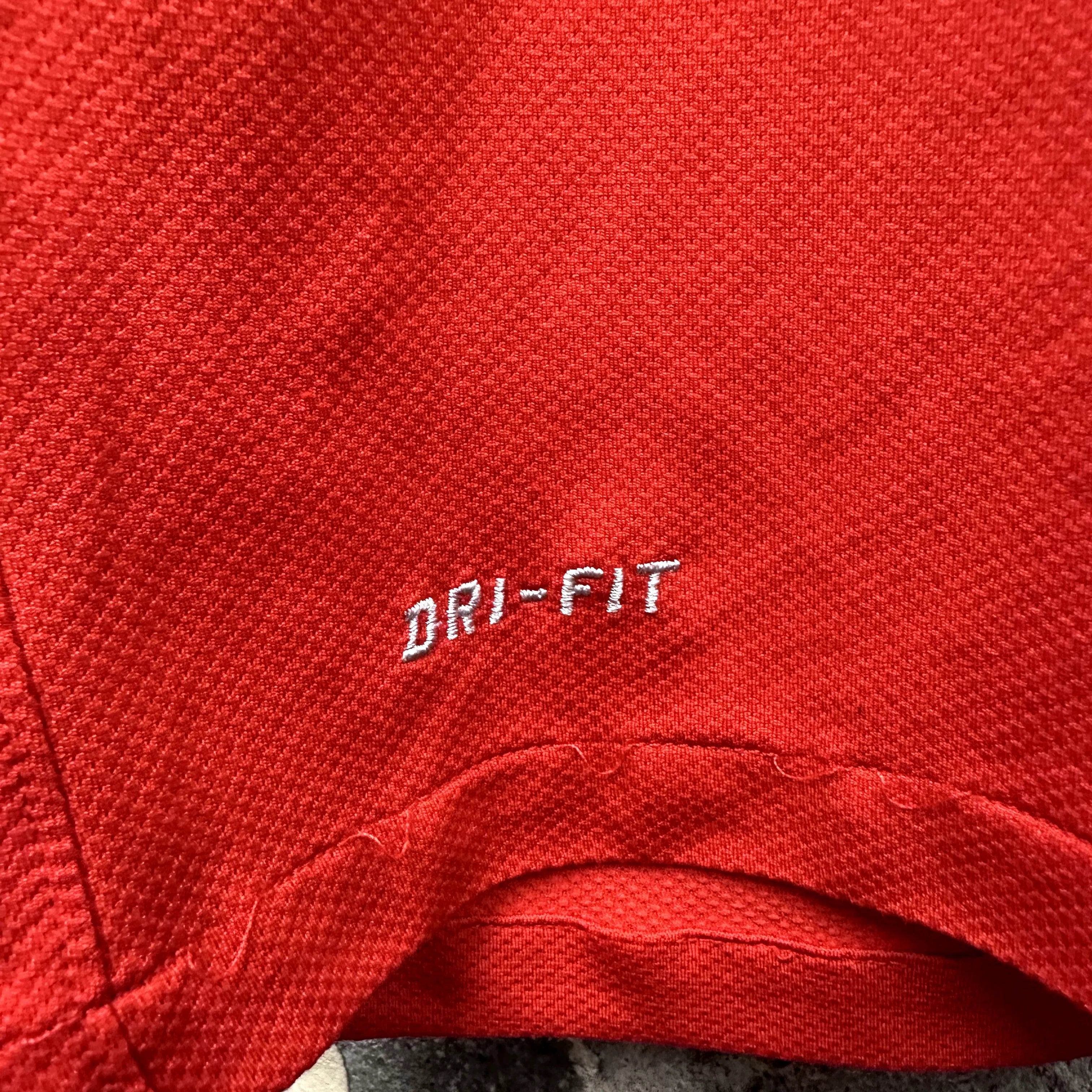 Product details: Red football shirt with white chest band, embroidered Spartak Moscow crest with gold star, Nike Swoosh, bold Cyrillic sponsor print, "FCSM" lettering at back neck, and Dri-Fit breathable mesh fabric. Authentic Nike patch and vintage style. Brand: Nike.| Label Size | |