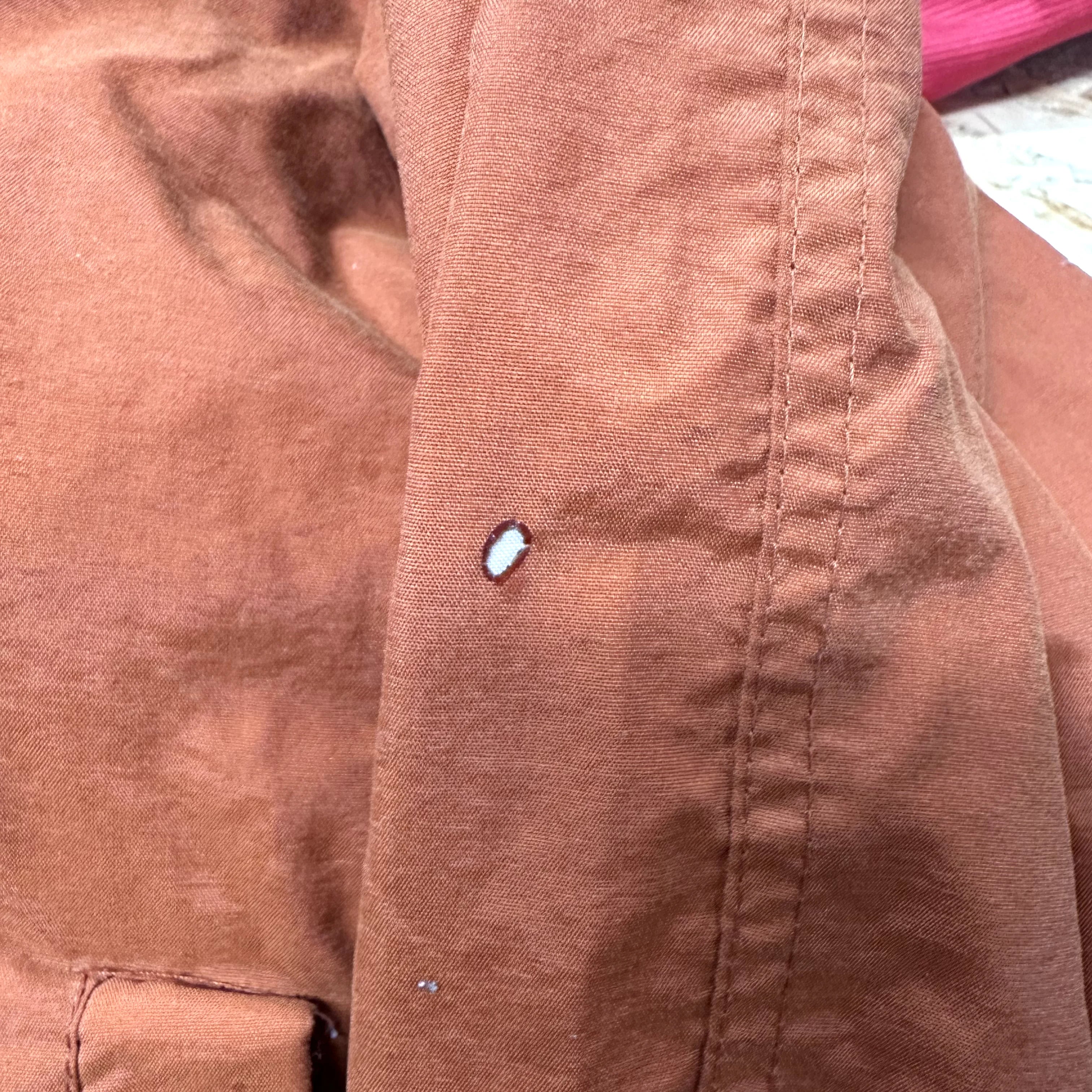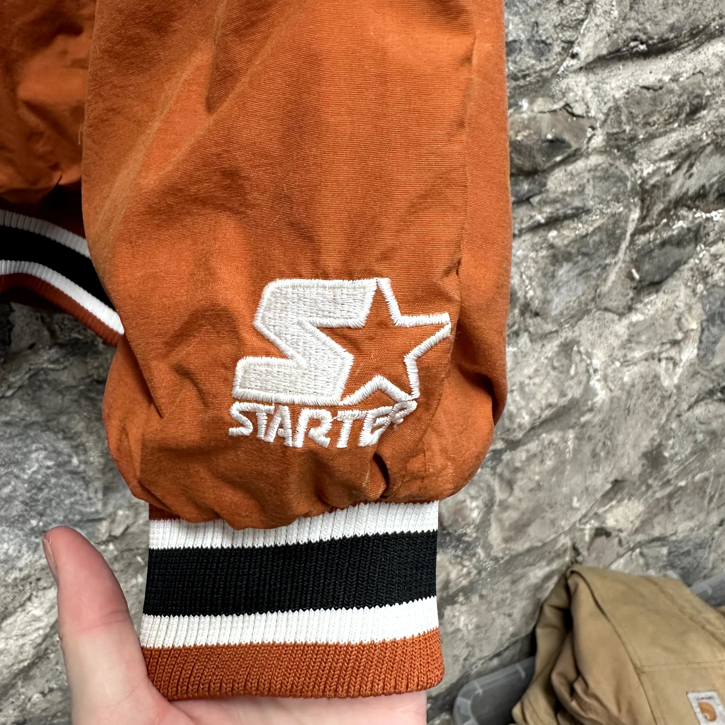 Product details: Burnt orange pullover windbreaker, ribbed striped collar/cuffs/hem, embroidered Longhorn logo on chest, Starter logo on sleeve, snap front, side zip closure with branded pull, visible sleeve flaw, made in Korea, late 90s production code. Lined body and sleeves. Brand: Starter.| Label Size | |