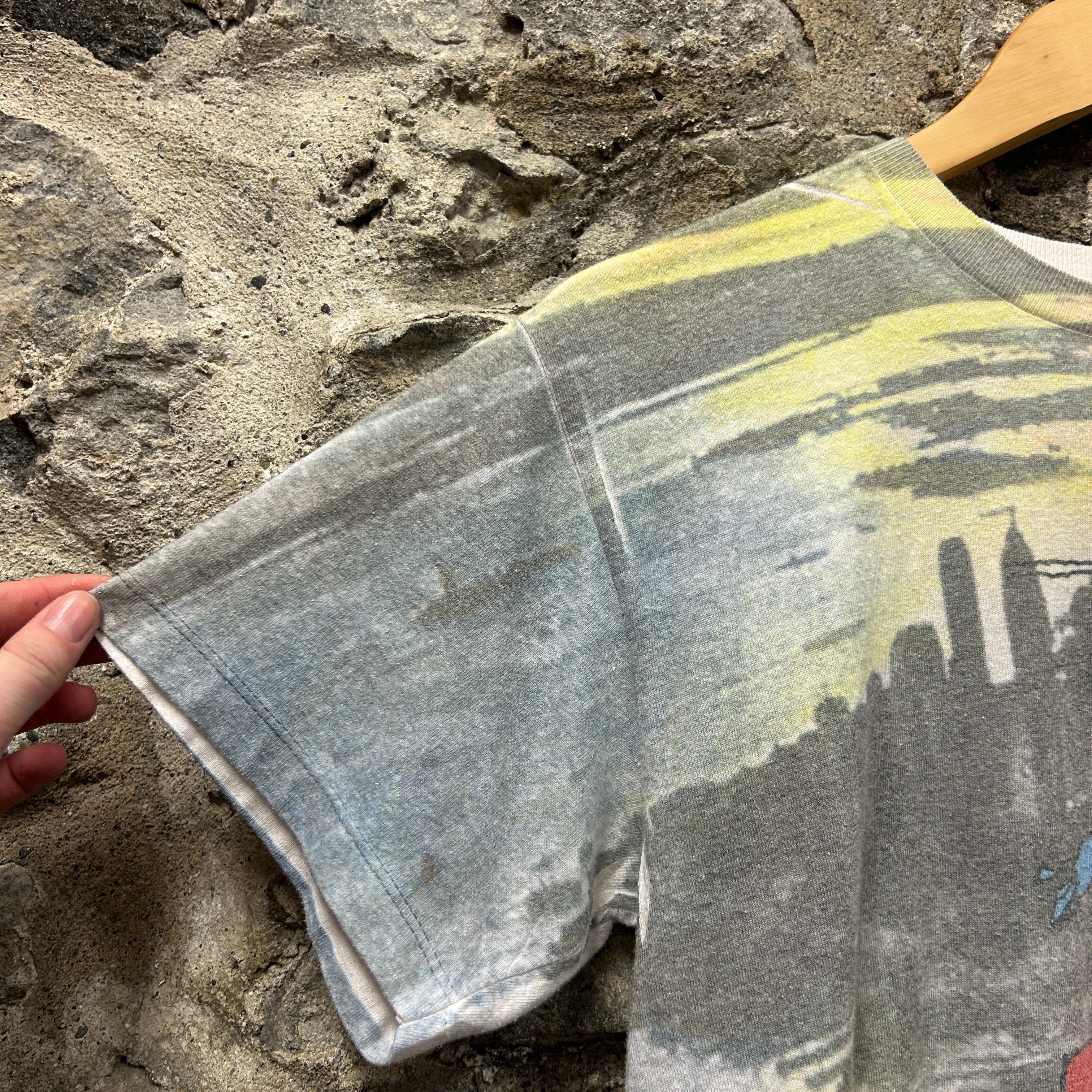 Product details: Vintage-style graphic T-shirt featuring Snoopy as the Flying Ace on his red doghouse against a faded city skyline with Woodstock and a soft airbrushed sunset effect. All-over front print with intentionally washed-out, worn-in look, short sleeves, and classic crew neck. Back is plain light grey. Brand: .| Label Size | |