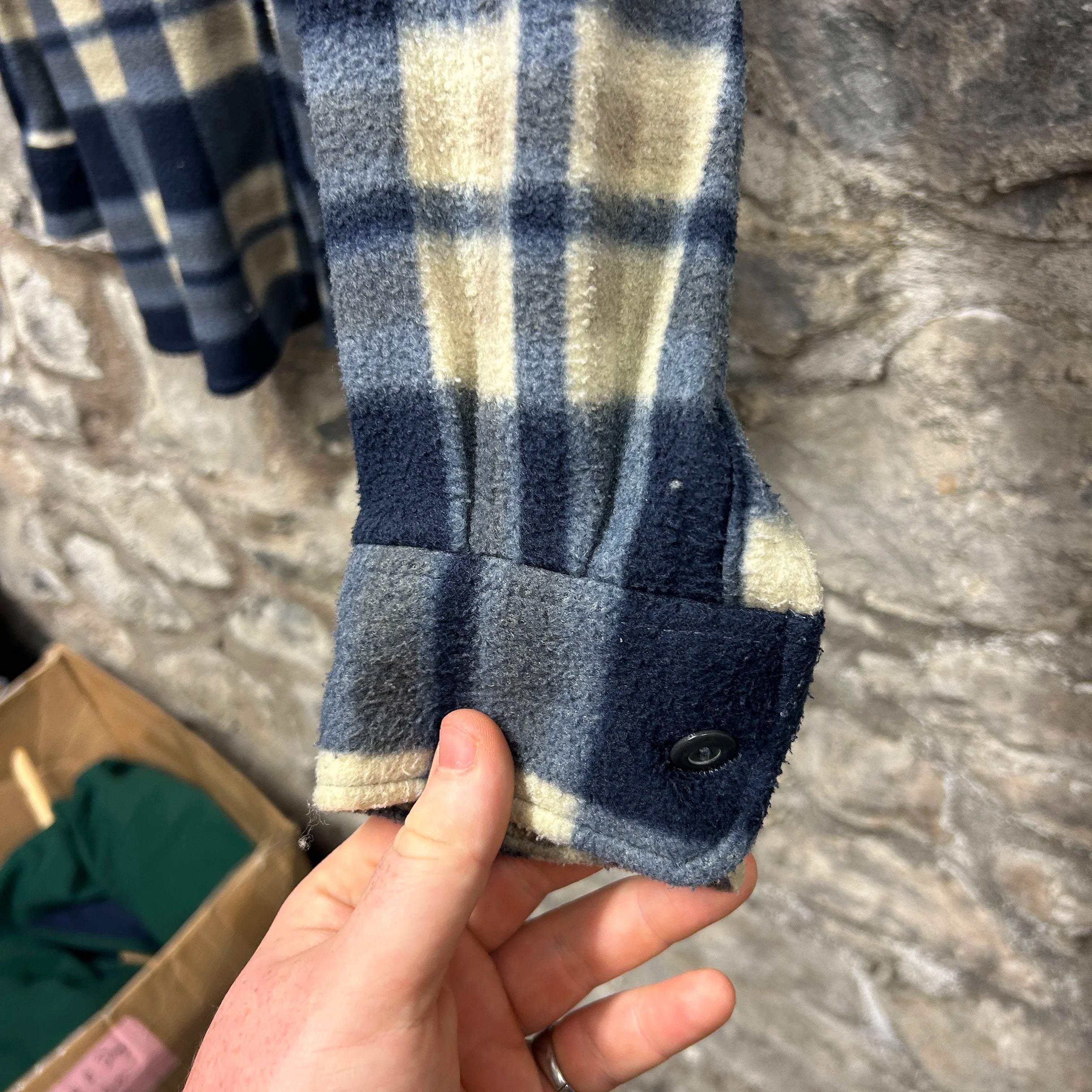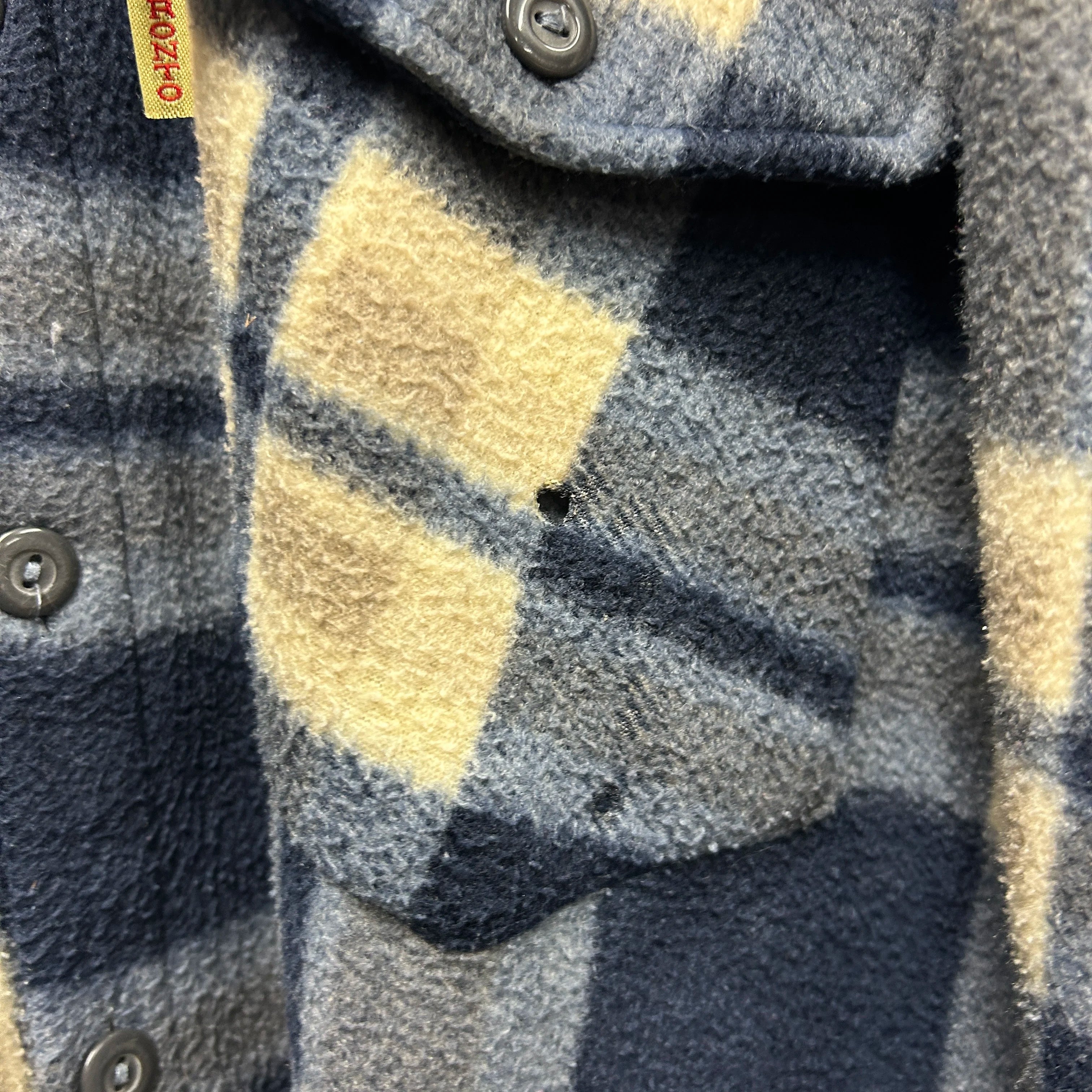 Product details: Navy and beige plaid design, button front, two chest flap pockets with button closures, button cuffs, visible small hole near one pocket, Toronto Exclusive Collection label, soft fleece flannel texture. Brand: Toronto Exclusive Collection.| Label Size | |