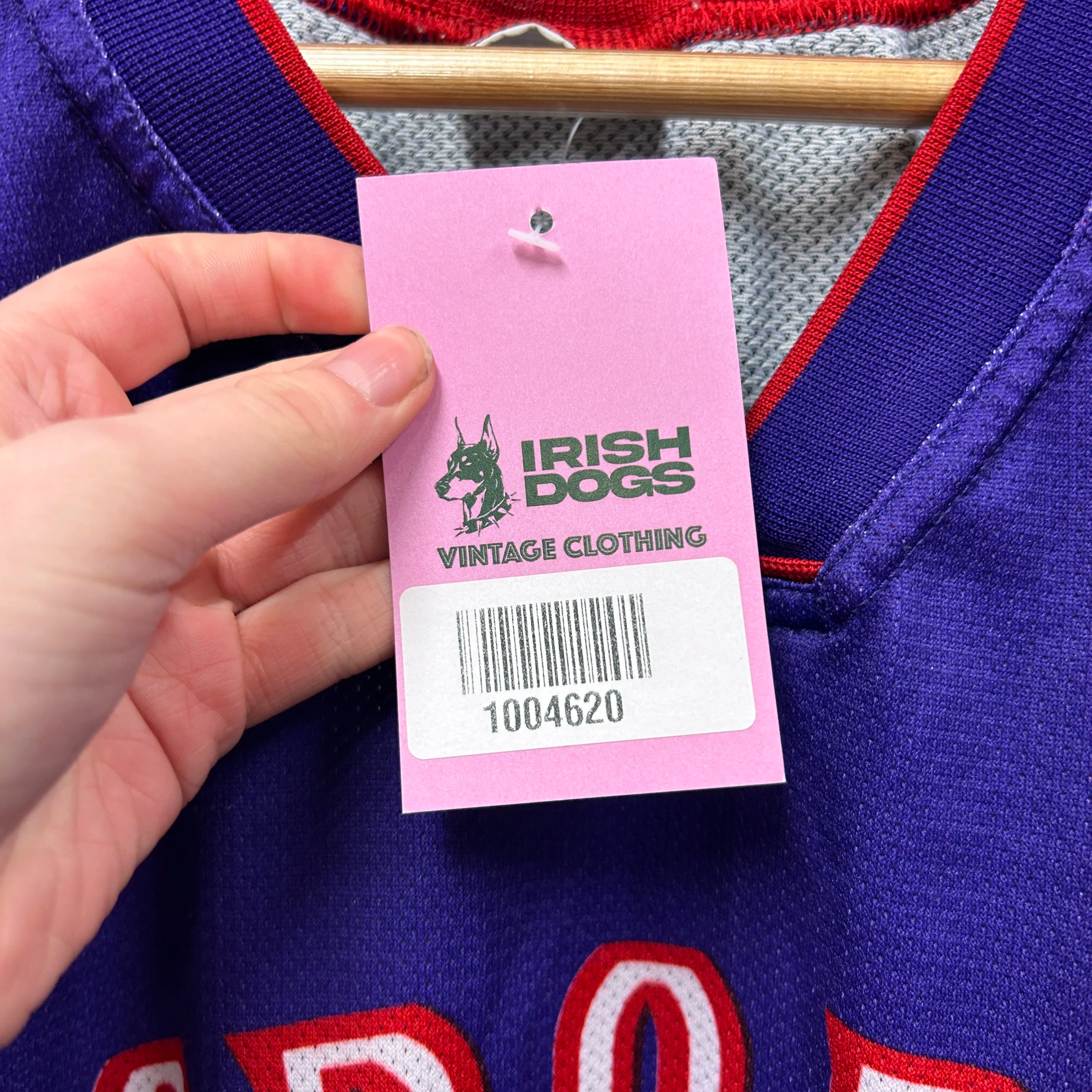 Product details: Toronto Raptors Vince Carter #15 jersey in purple with red trim, black mesh side panels, diagonal raptor claw marks, Champion embroideries, and authentic NBA branding. Brand: Champion.| Label Size | |