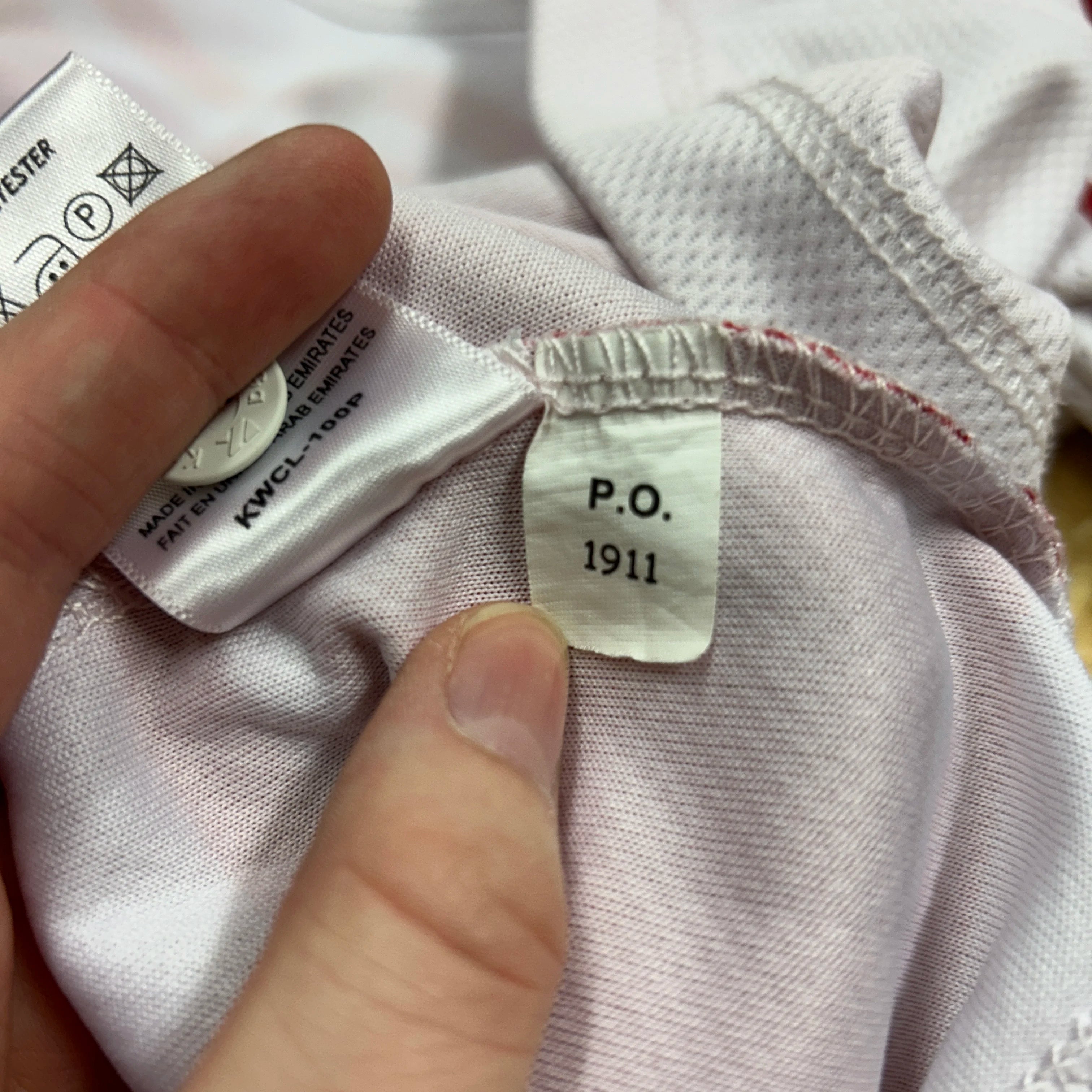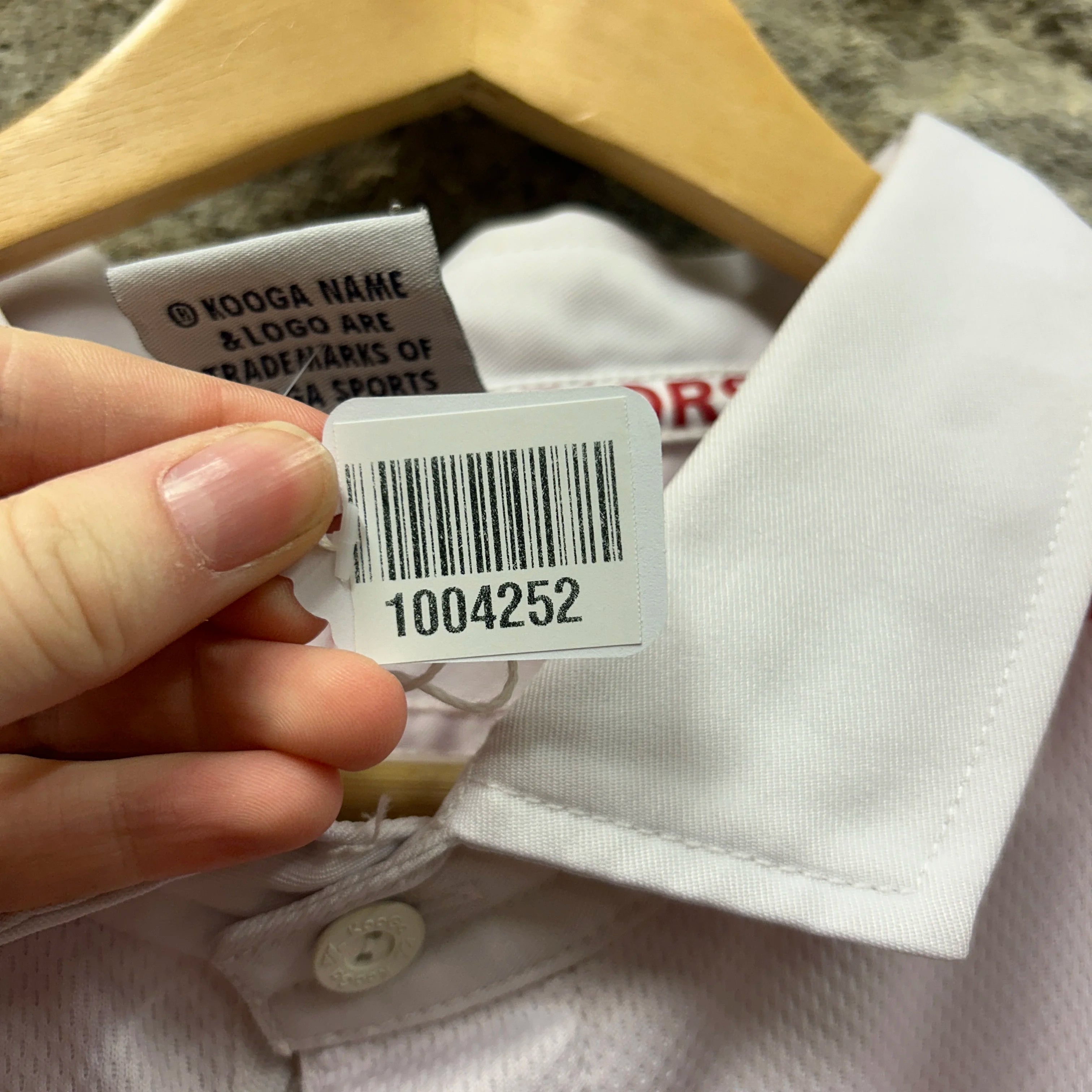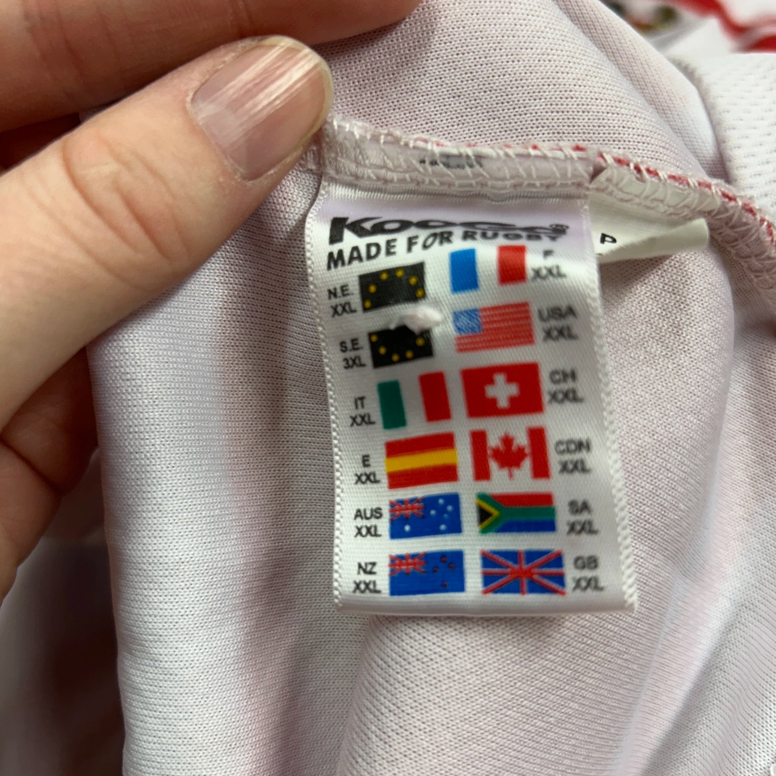 Product details: Embroidered Wigan Warriors crest, MECCA Bingo and totesport.com sponsorships, mesh polyester fabric, bold red and white stripes, classic rugby shirt collar, 'Kooga made for rugby' inner label, XX Large size. Brand: Kooga.| Label Size | |