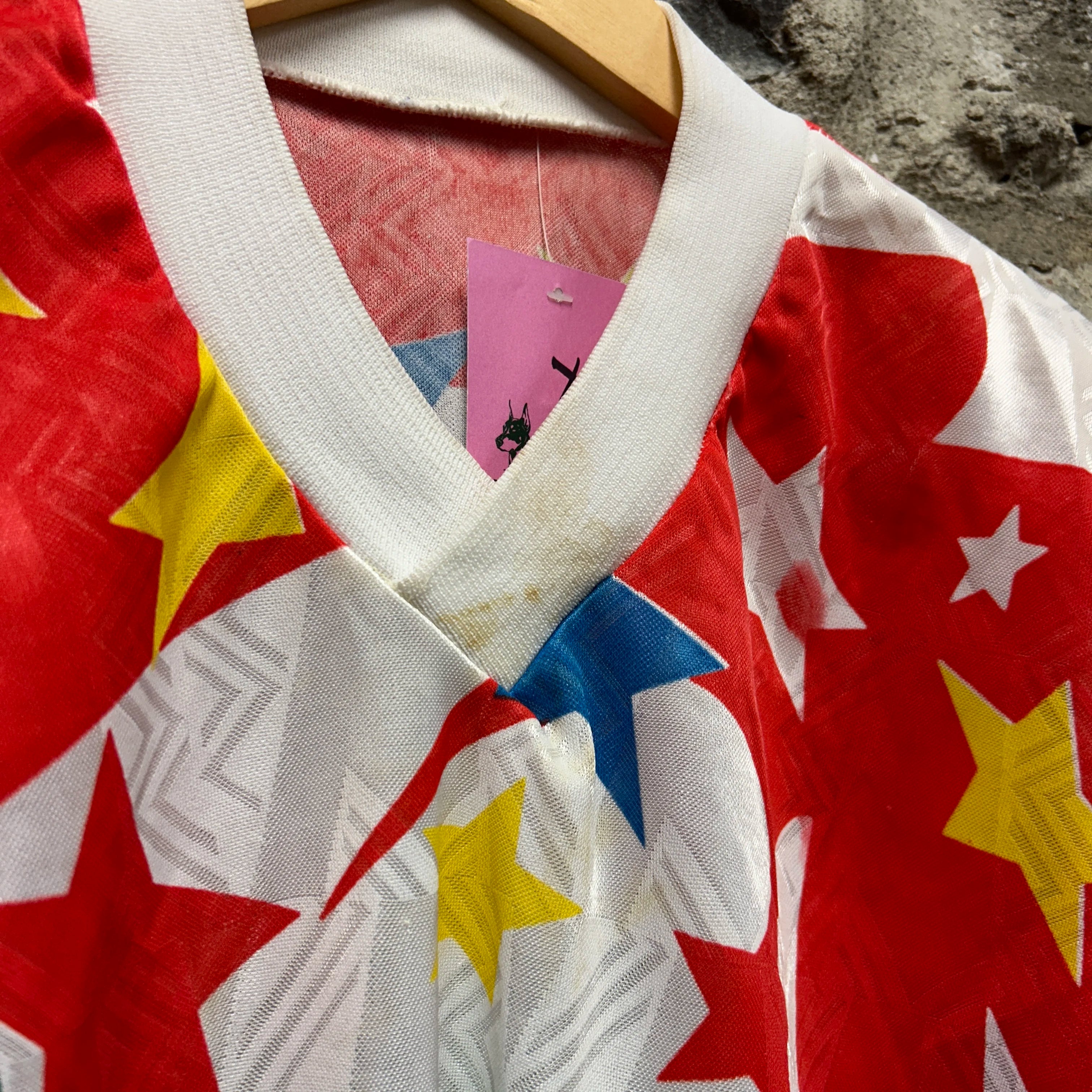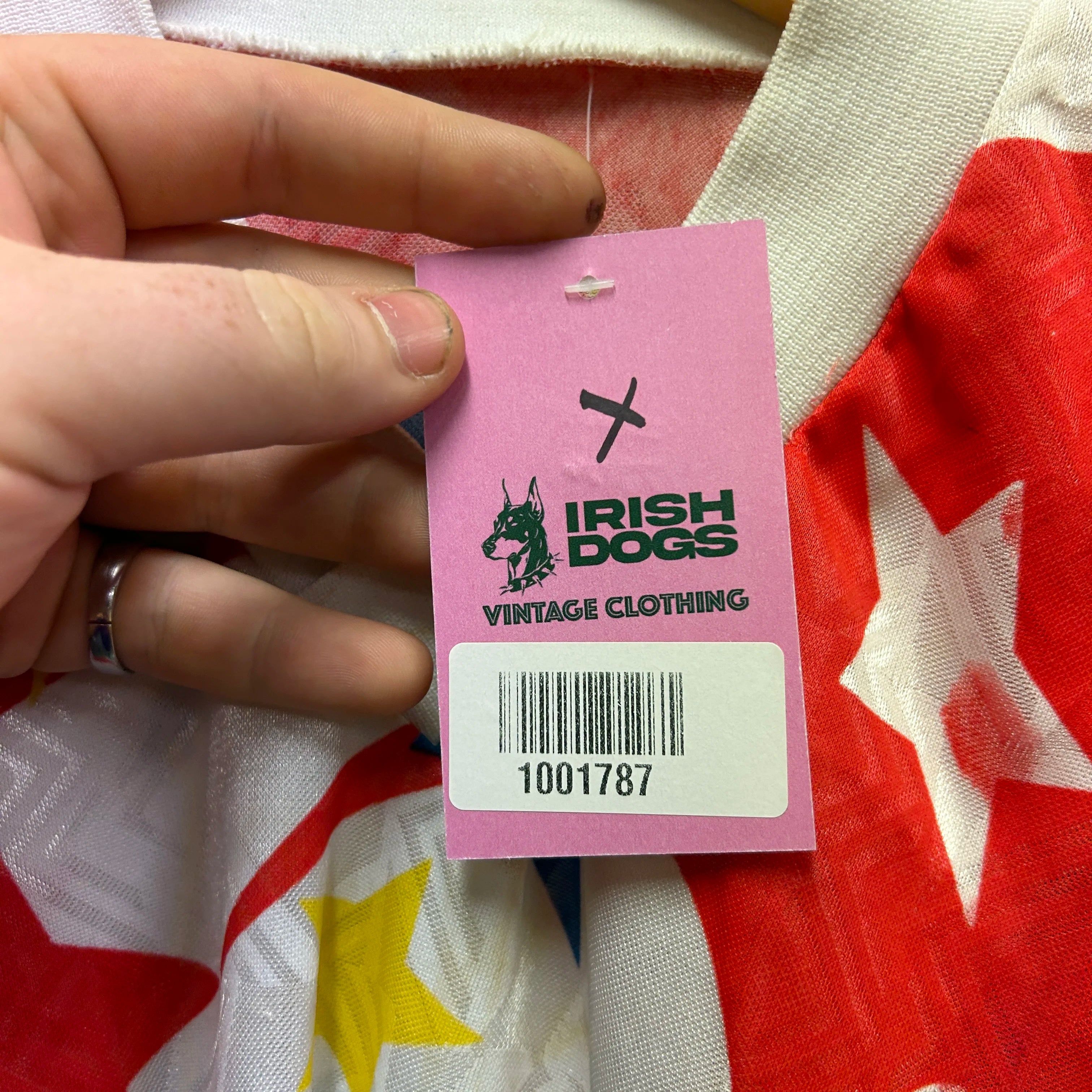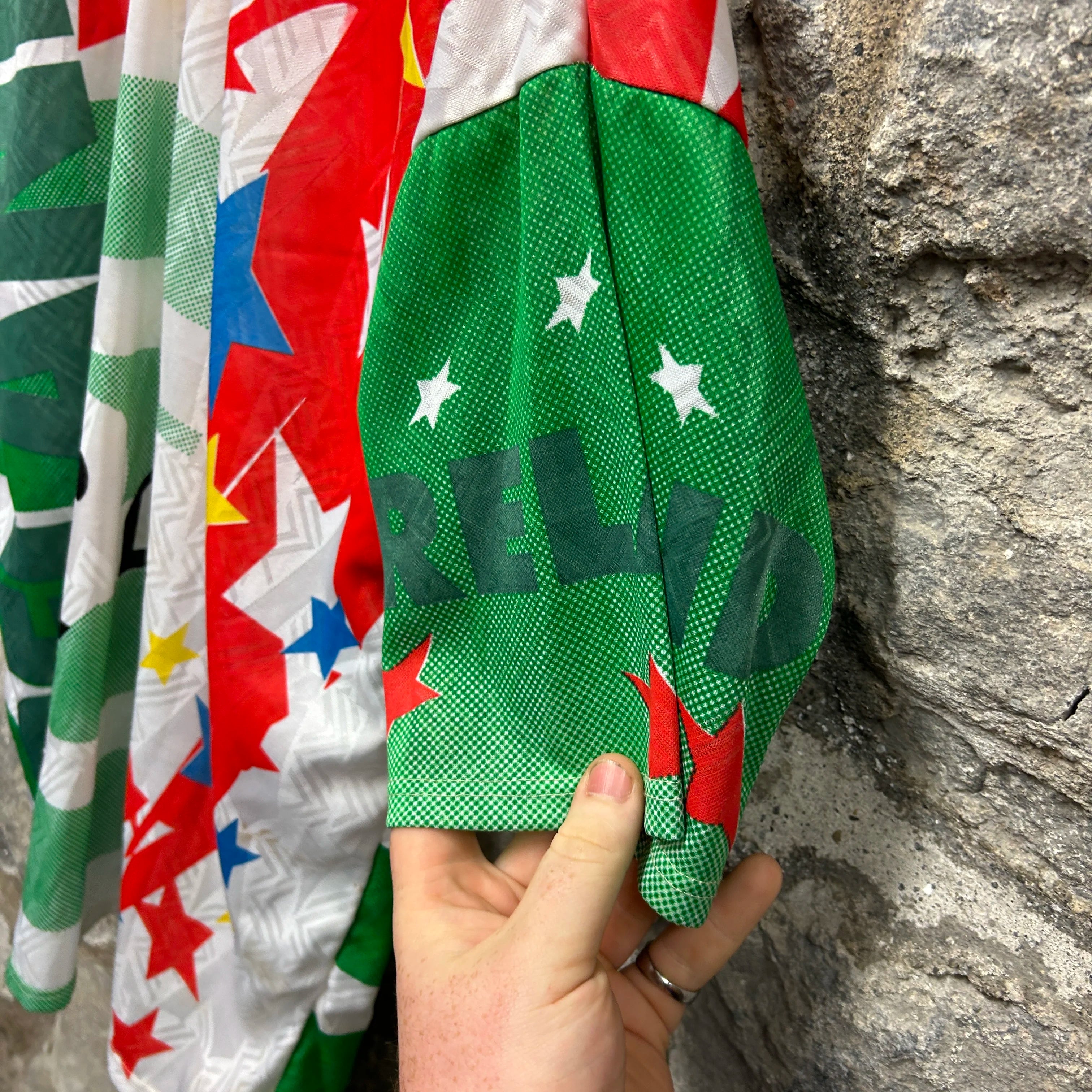 Product details: Color-blocked design with green, red, and white panels, large stars throughout, bold 'IRELAND' text, white ribbed collar, jacquard geometric woven pattern; minor collar discoloration. Brand: .| Label Size | |