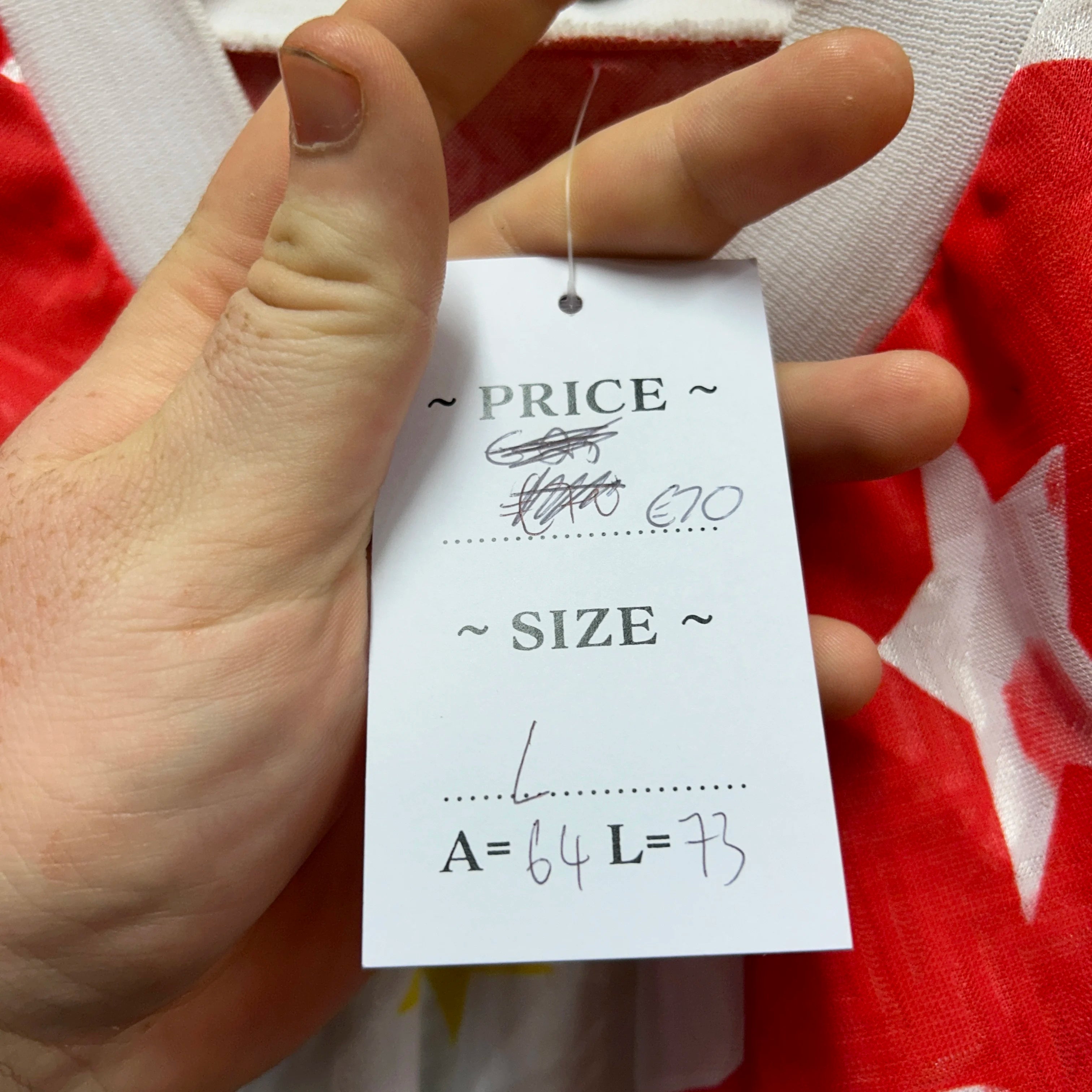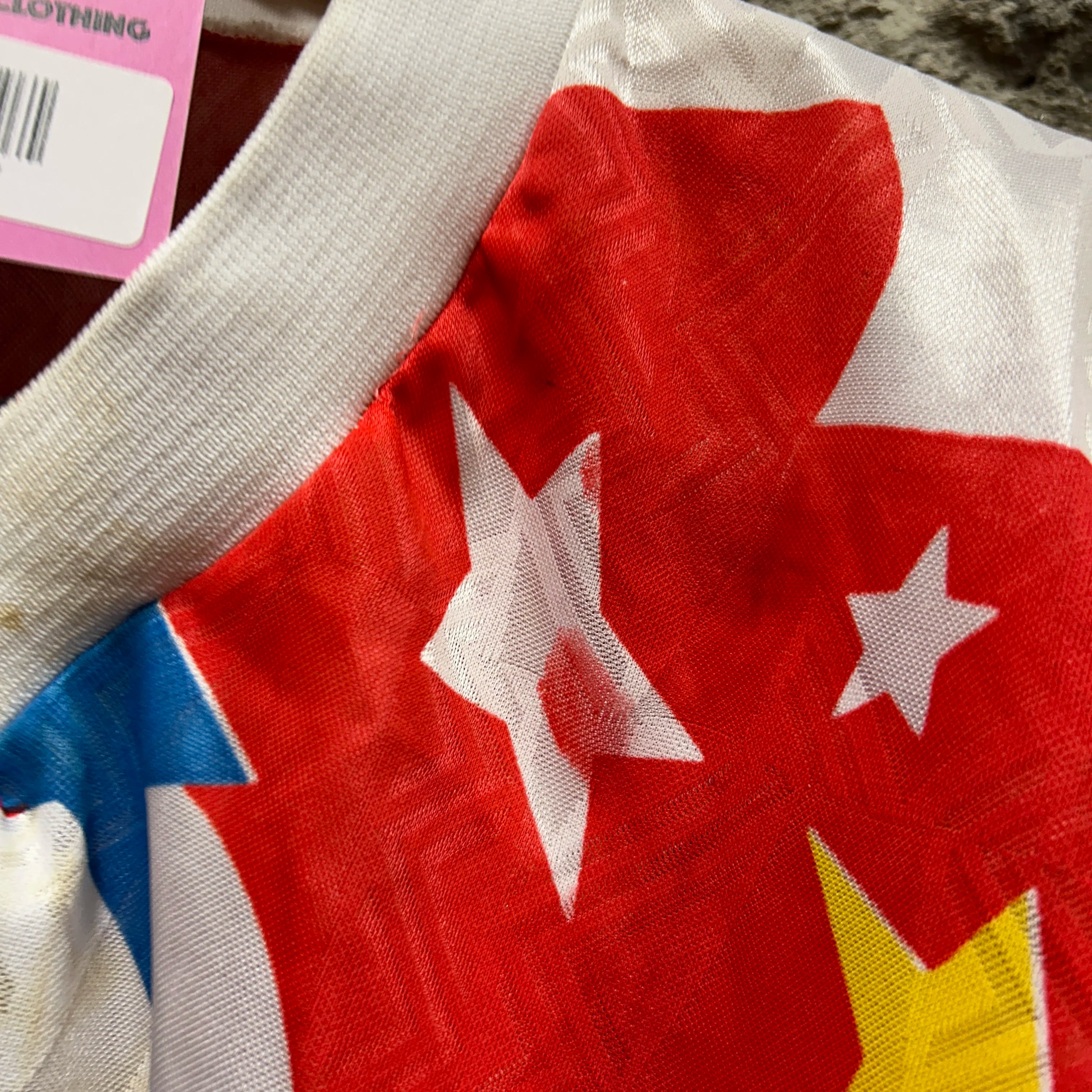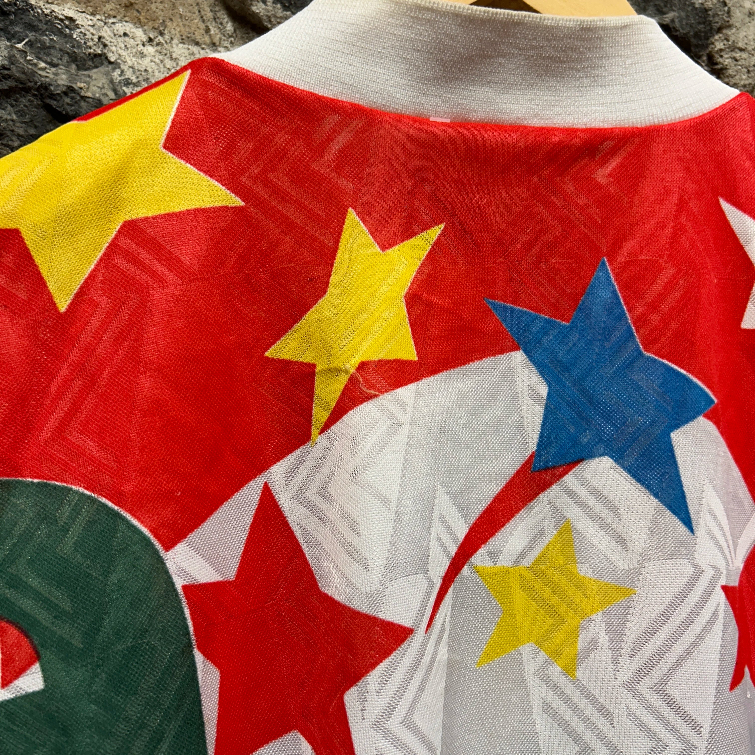 Product details: Color-blocked design with green, red, and white panels, large stars throughout, bold 'IRELAND' text, white ribbed collar, jacquard geometric woven pattern; minor collar discoloration. Brand: .| Label Size | |